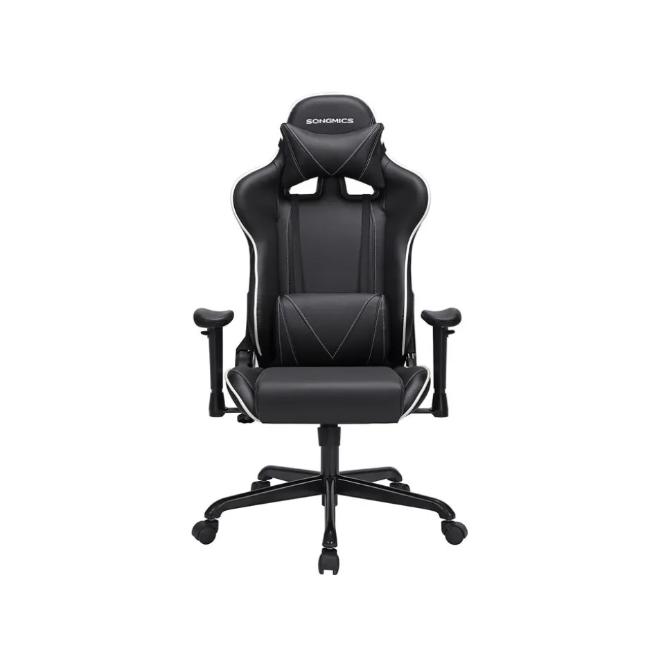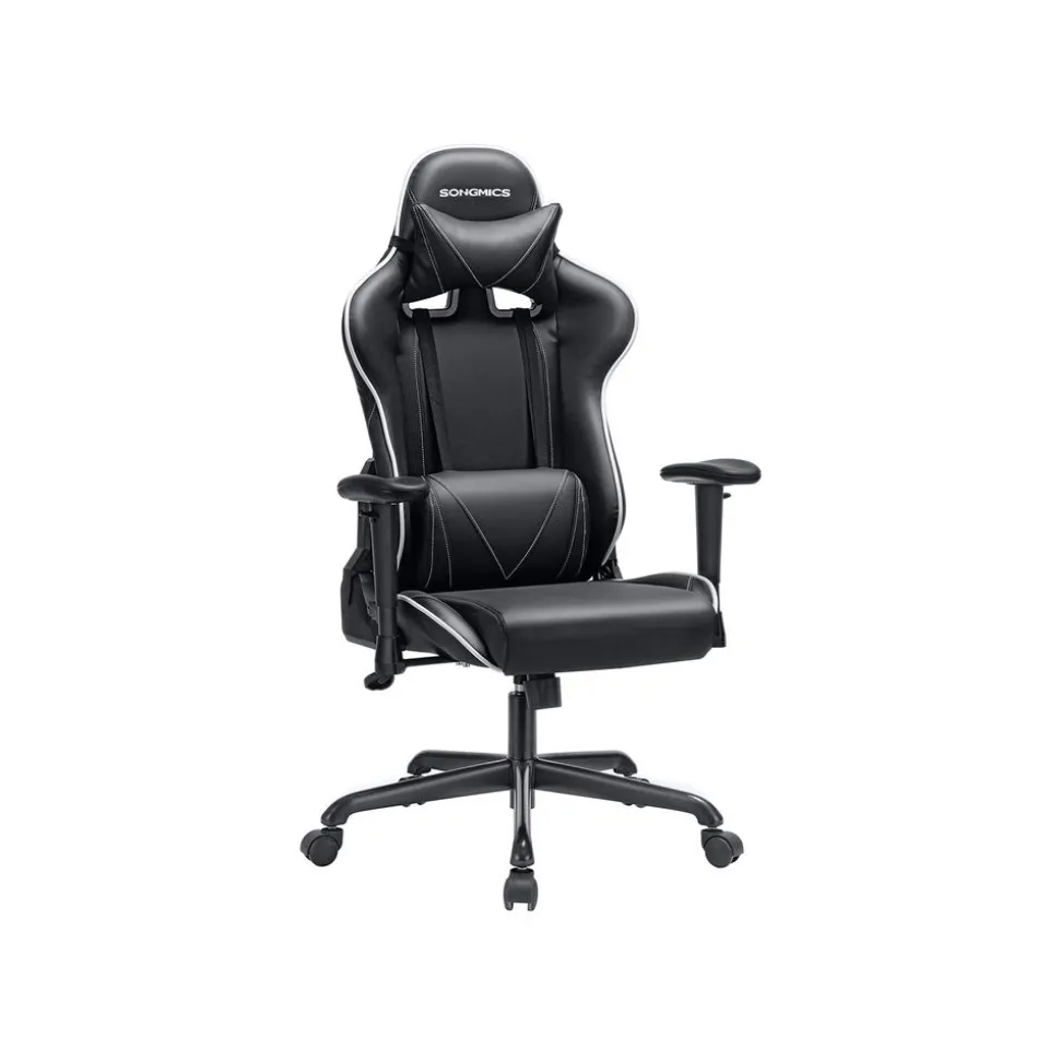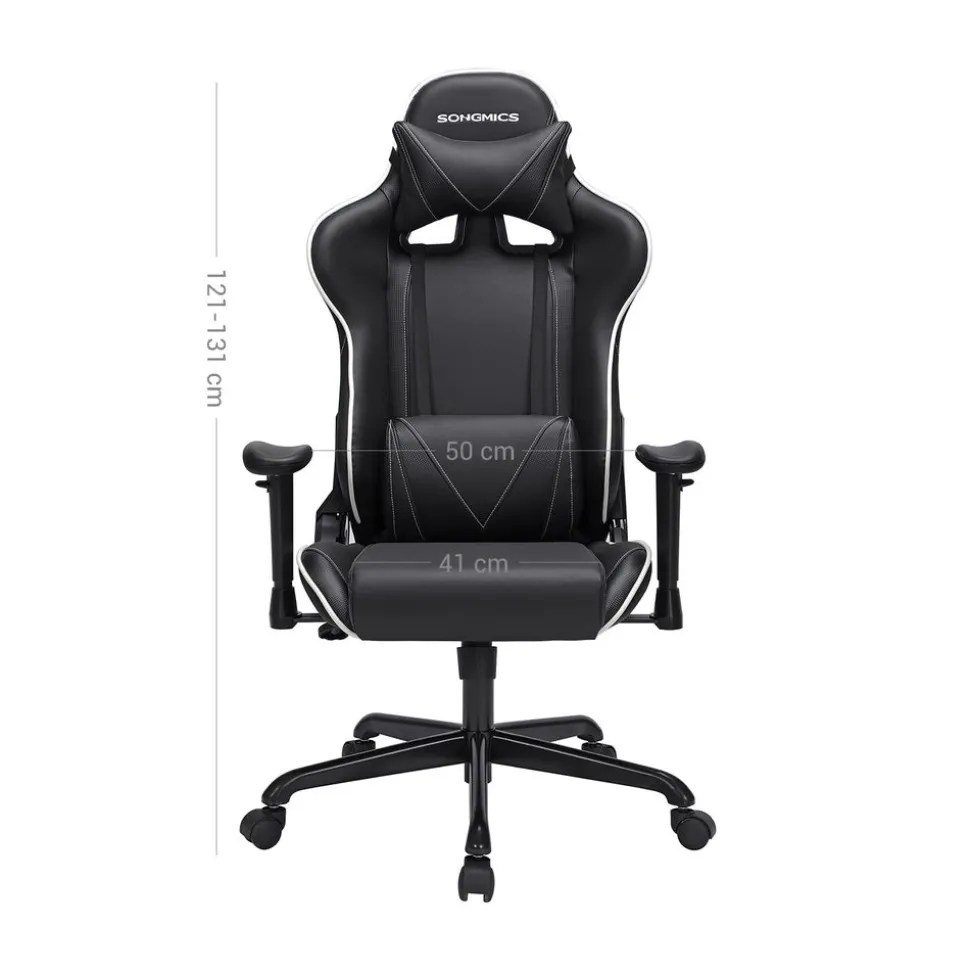 – Couleur : NoirDimensions du produit :– Hauteur du produit : 120-137 cm– Largeur du produit : 70 cm– Profondeur du produit : 75 cm– Hauteur de l’assise :45-53 cm– Largeur de l’assise : 48 cm– Profondeur de l’assise : 53 cm– Hauteur accoudoir/assise :22 cm– Hauteur du dossier :67 cm– Diamètre du piètement en étoile : 70 cm– Diamètre de la roulette : 50 mm– Diamètre du tige de la roulette : 11 mmMatériaux :– Roulette: Nylon– Piètement en étoile : Nylon– Armature des accoudoirs : Nylon– Surface des accoudoirs : Polyuréthane– Assise : Mousse + simili cuir + polyester– Poids : 17,5 kg– Charge maximale : 150 kgLivraison:– 1 x Fauteuil de bureau– 1 x Clé allen– 1 x Sachet d’accessoires– 1 x Notice de montage (FR, DE, EN, ES, IT)Précautions de SONGMICS:– Une position assise prolongée a des conséquences négatives sur votre corps. Effectuez des petits mouvements sur votre fauteuil et étirez-vous toutes les demi-heures.