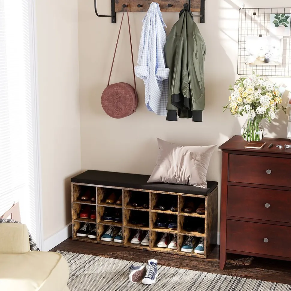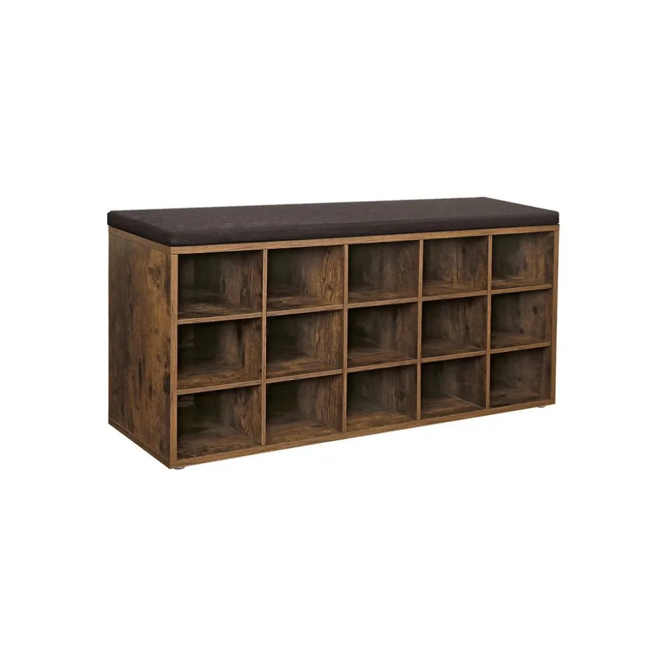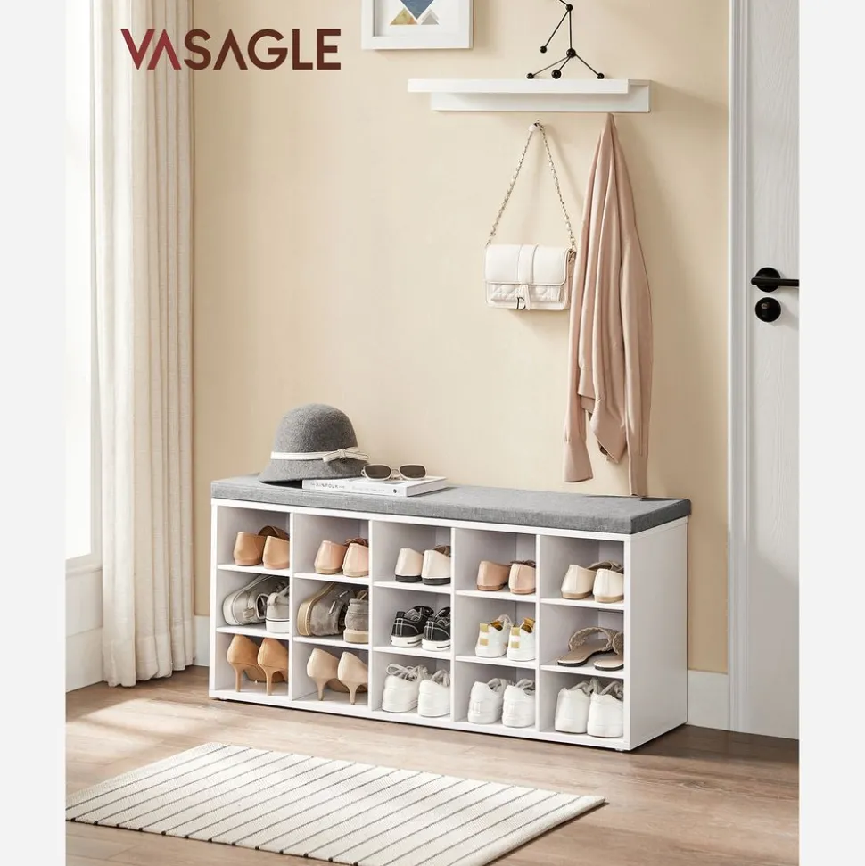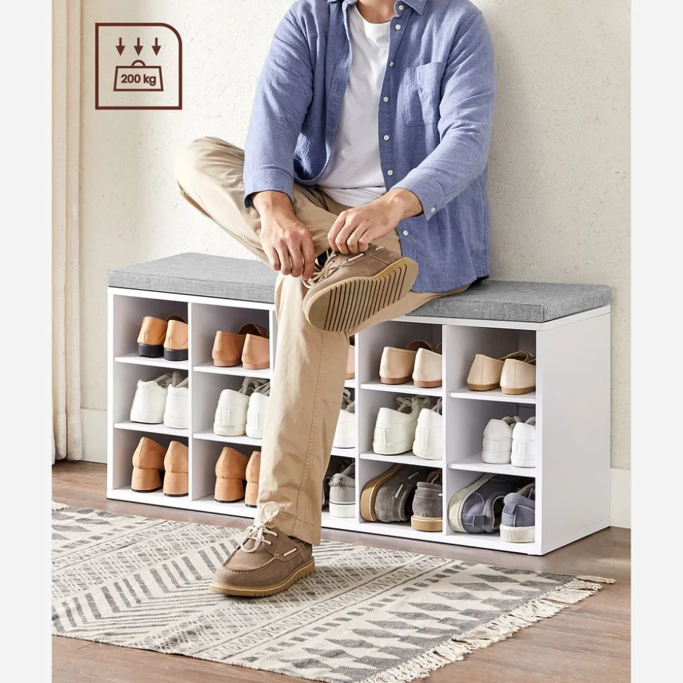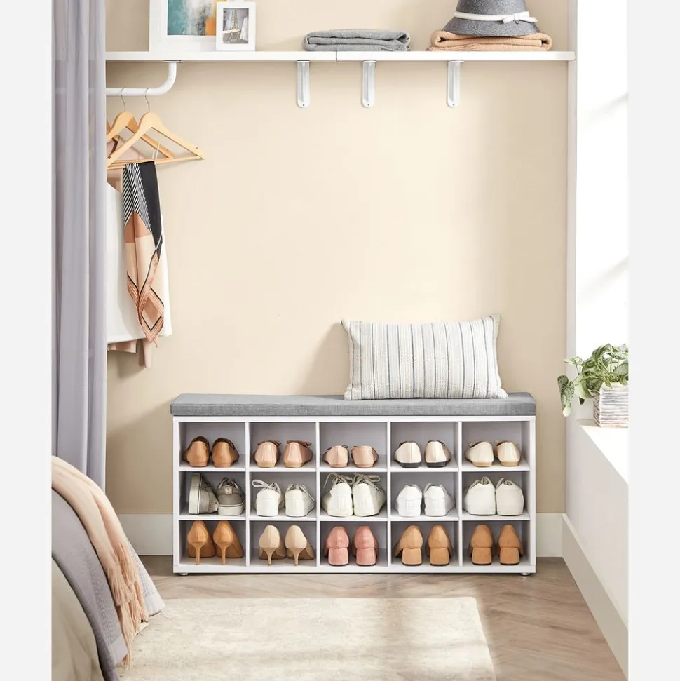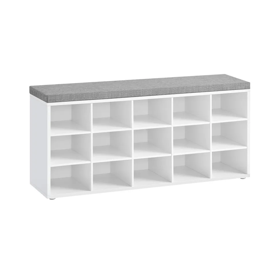 Ce que vous obtenez : Un banc à chaussures avec coussin rembourré sur lequel vous pouvez vous asseoir confortablement lorsque vous changez de chaussures ainsi que 15 compartiments pour ranger vos chaussures et garder votre entrée bien ordonnée