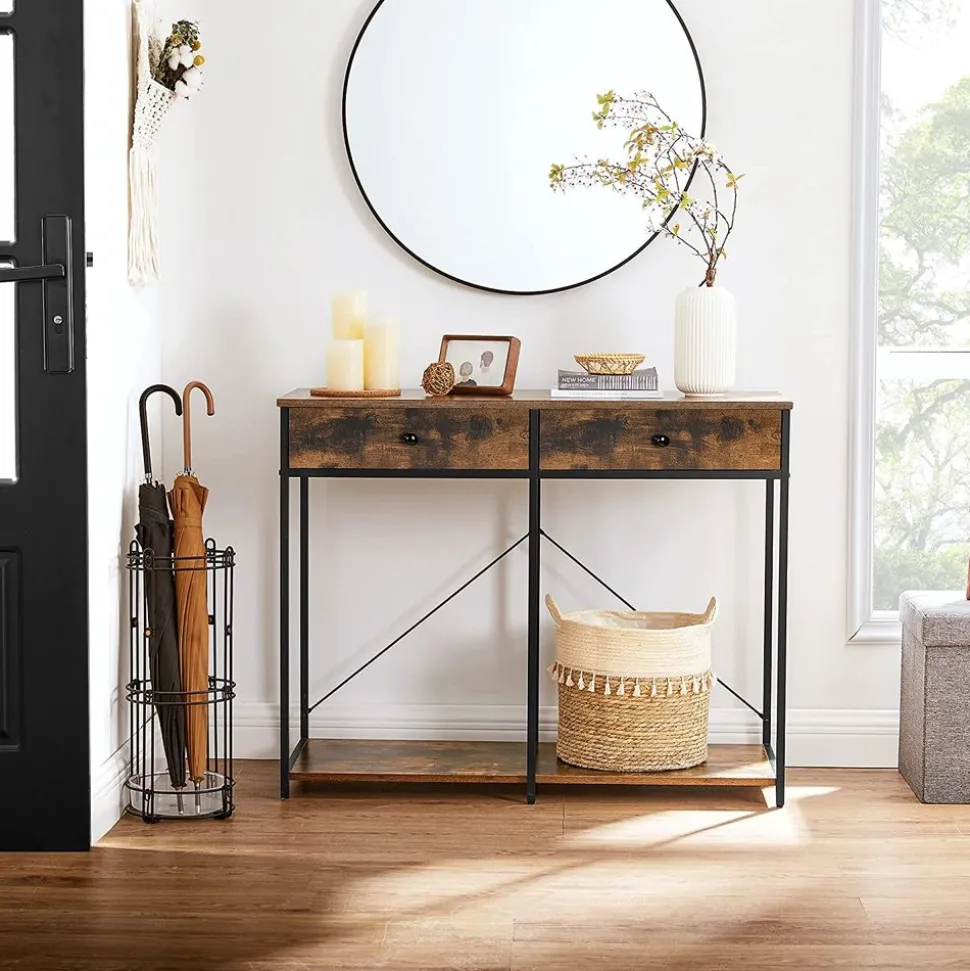 Ce que vous obtenez : Une table d’entrée de style industriel avec 2 tiroirs en tissu, un kit anti-basculement, une clé Allen et des instructions claires pour un montage facile