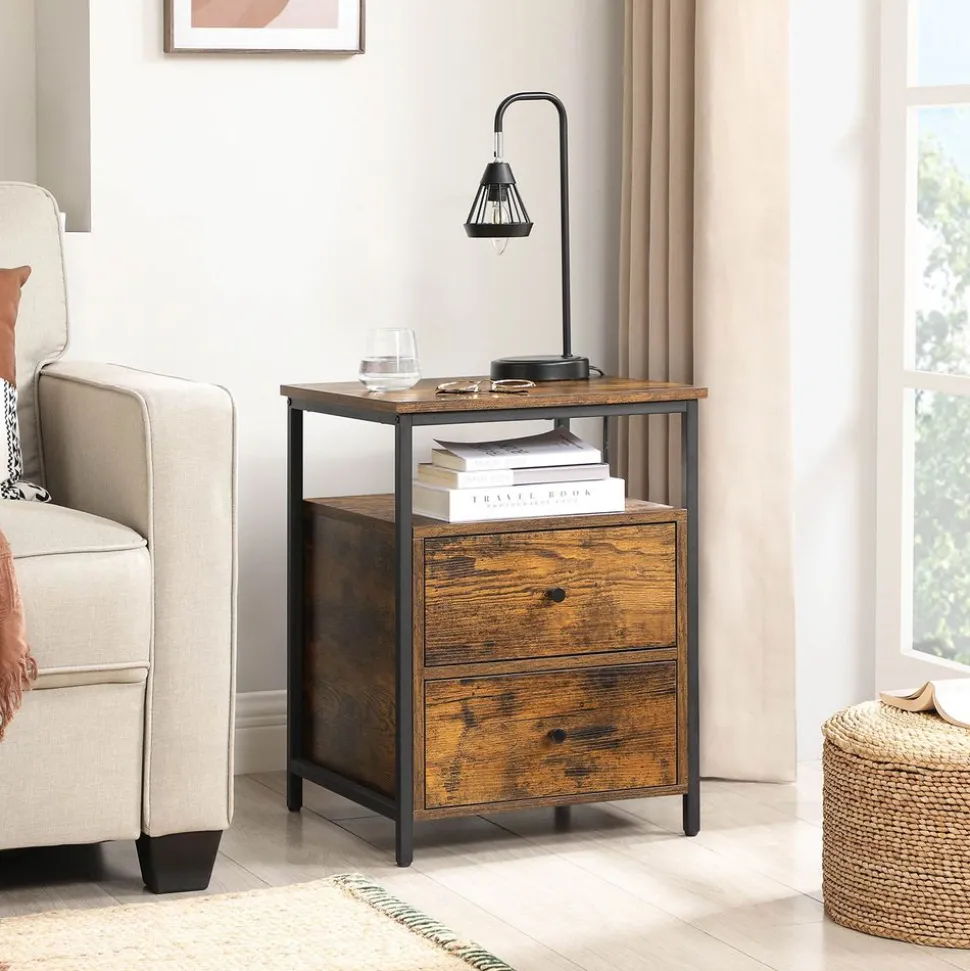 UN PEU PLUS DE STYLE : Lorsque vous décorez une pièce, n’oubliez pas les coins ! Cette table de chevet marron rustique et noir apporte une ambiance de style industriel à votre chambre