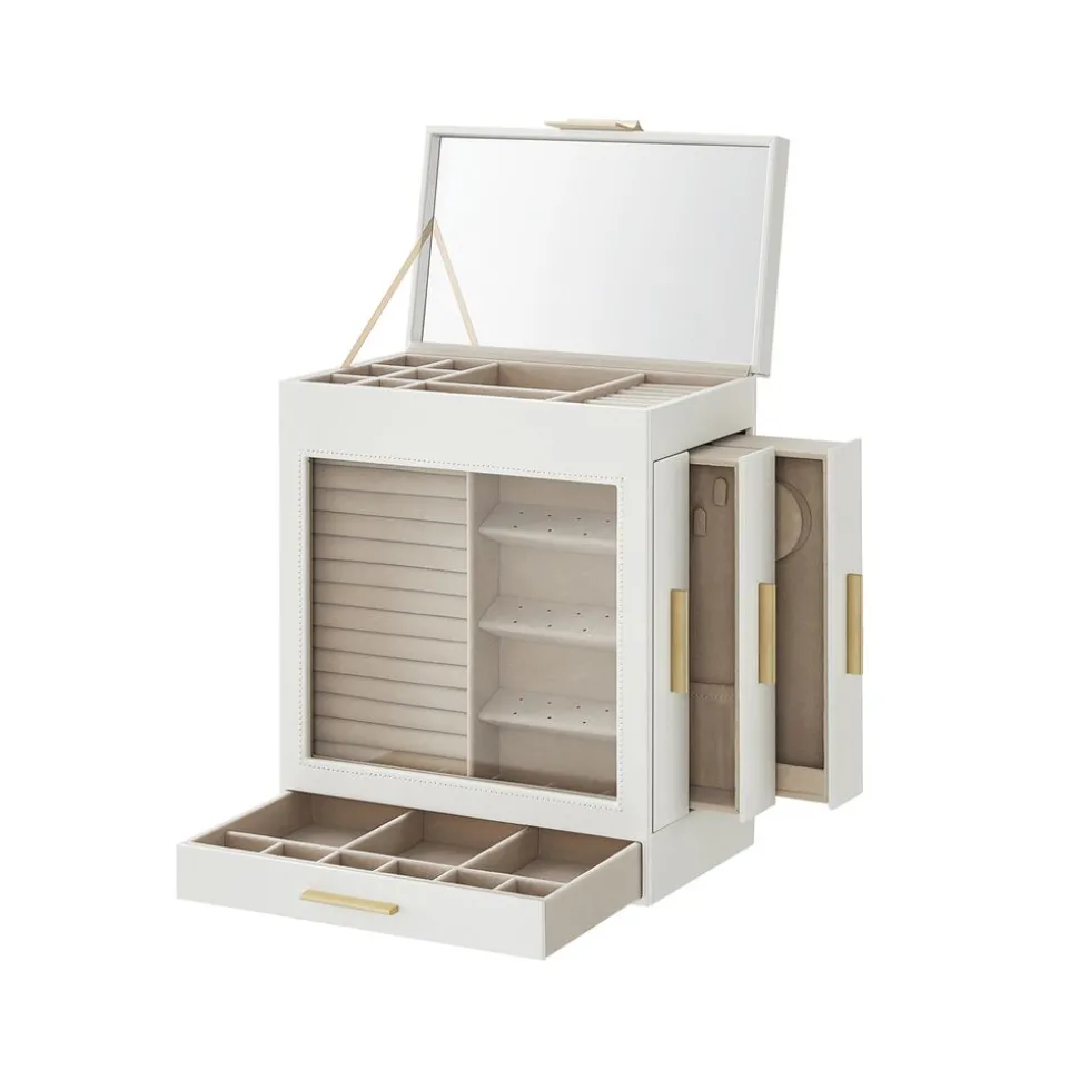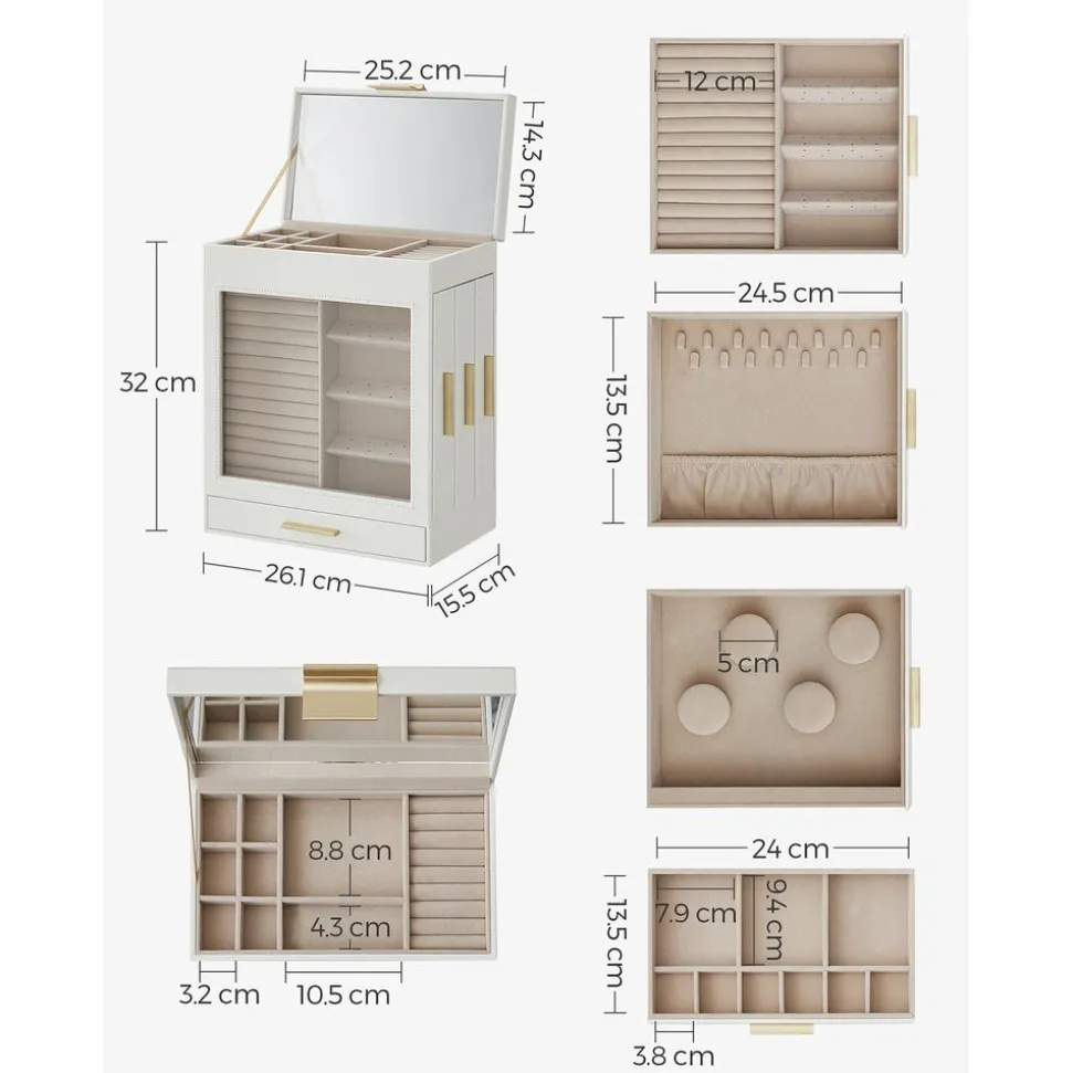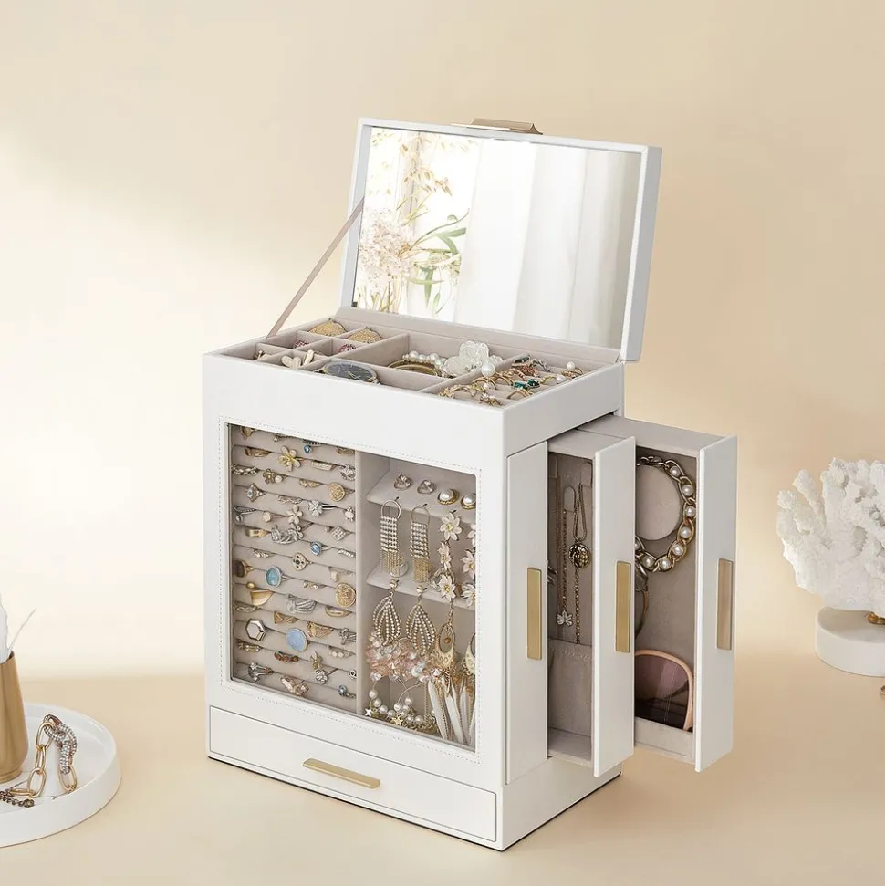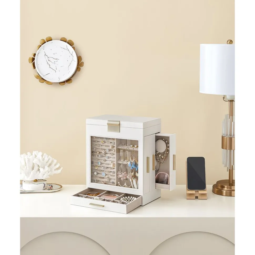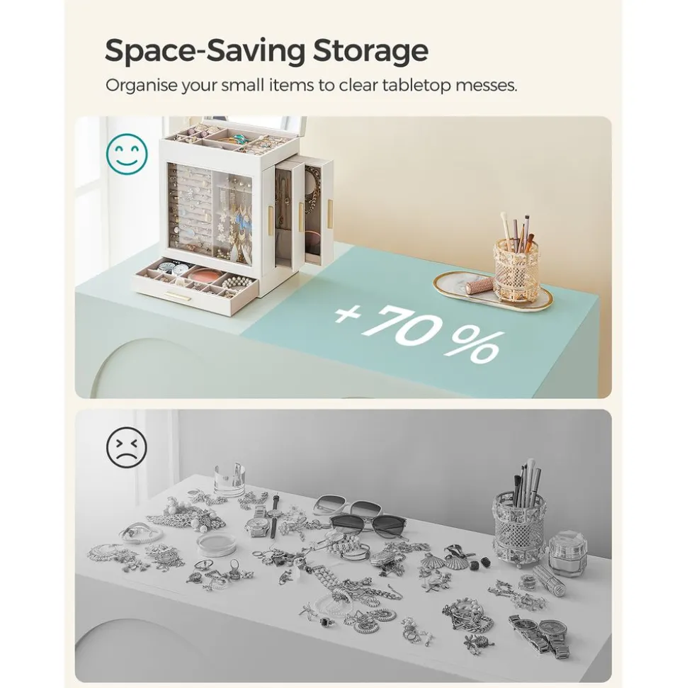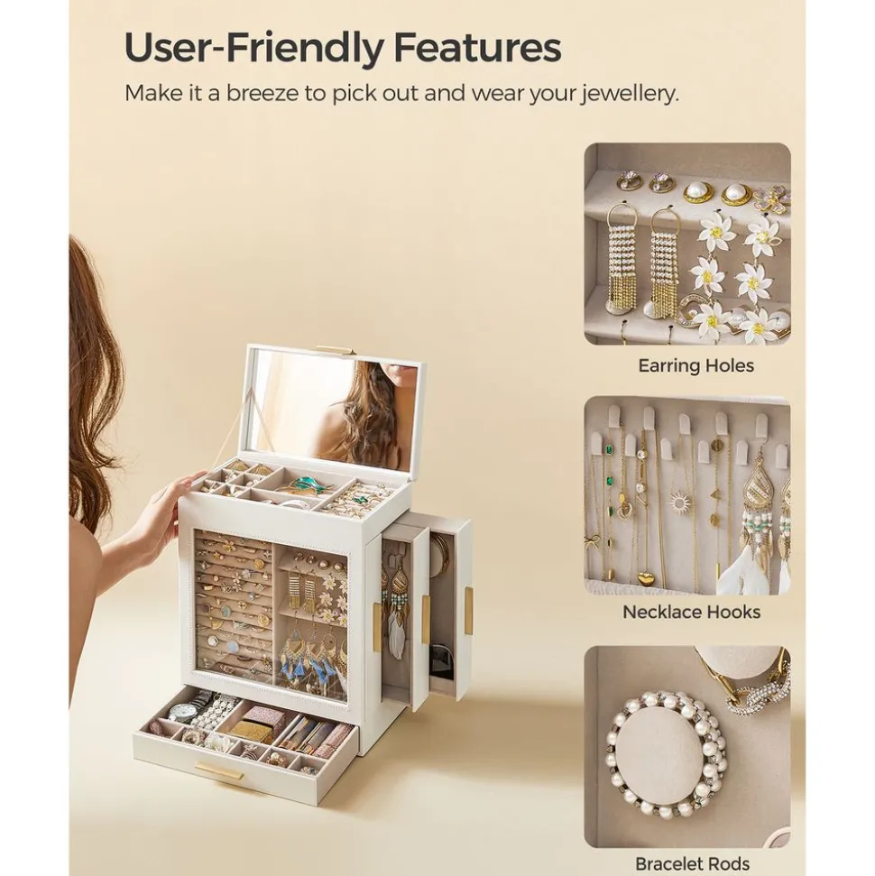 Rangement vertical & horizontal : 3 tiroirs latéraux pour suspendre les colliers, les boucles d’oreilles, les bagues, les bracelets et les montres sans qu’ils ne s’emmêlent. Le niveau du haut et le tiroir du bas accueillent les broches, les accessoires pour cheveux…