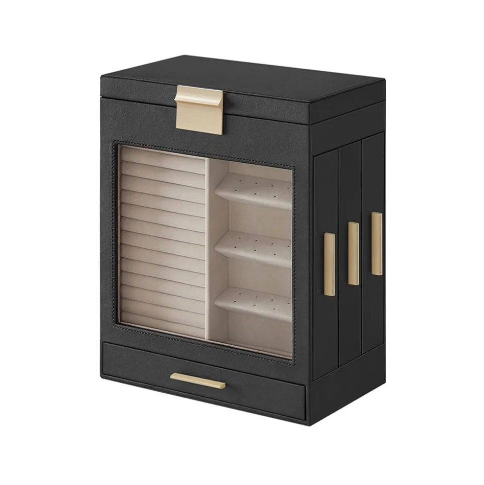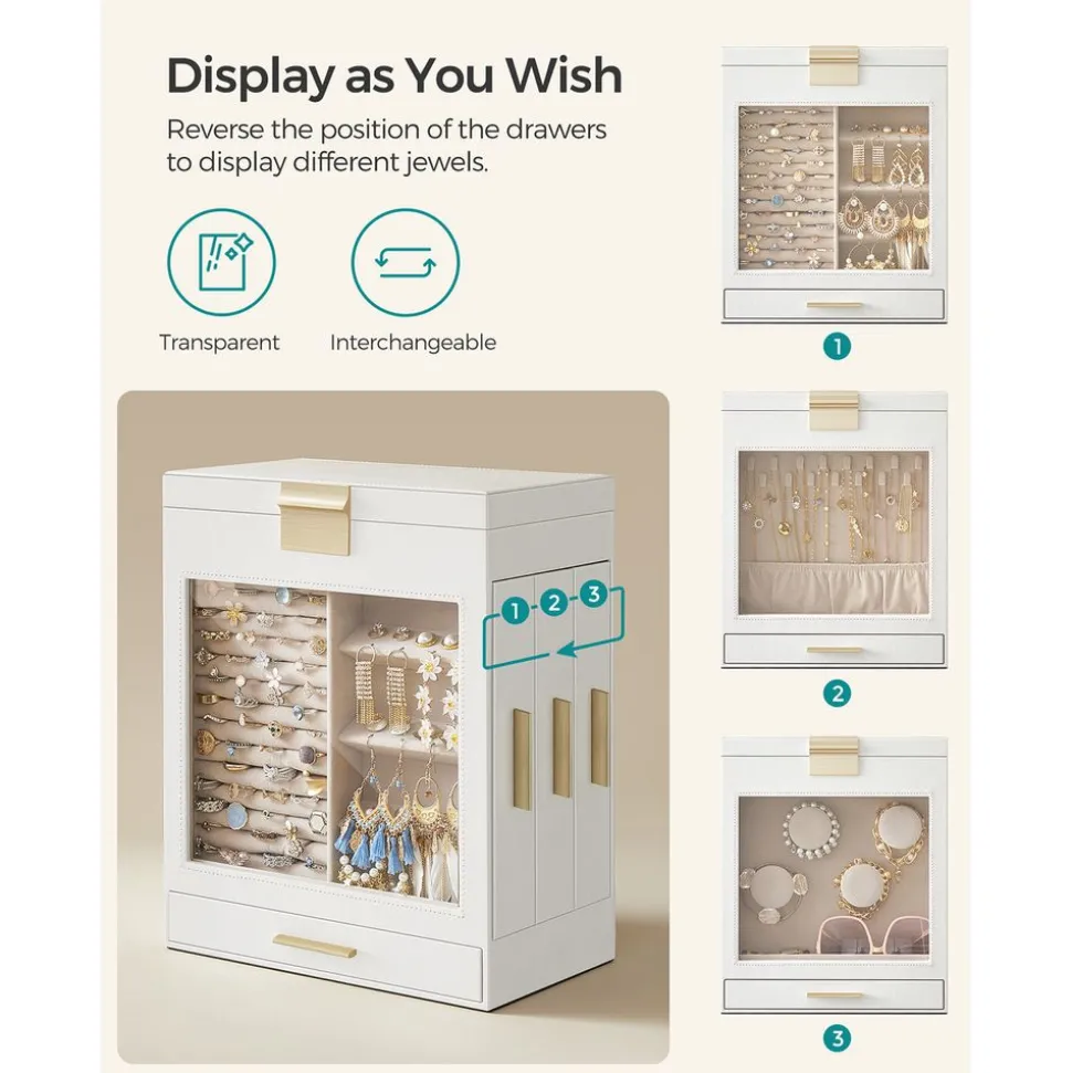 Les tiroirs latéraux : Vous pouvez changer l’ordre et les positions des 3 tiroirs afin de voir les différents bijoux à travers la fenêtre transparente. Vos bijoux sont bien protégés de la poussière