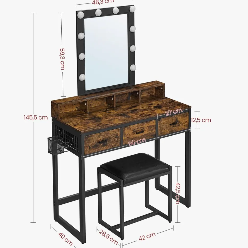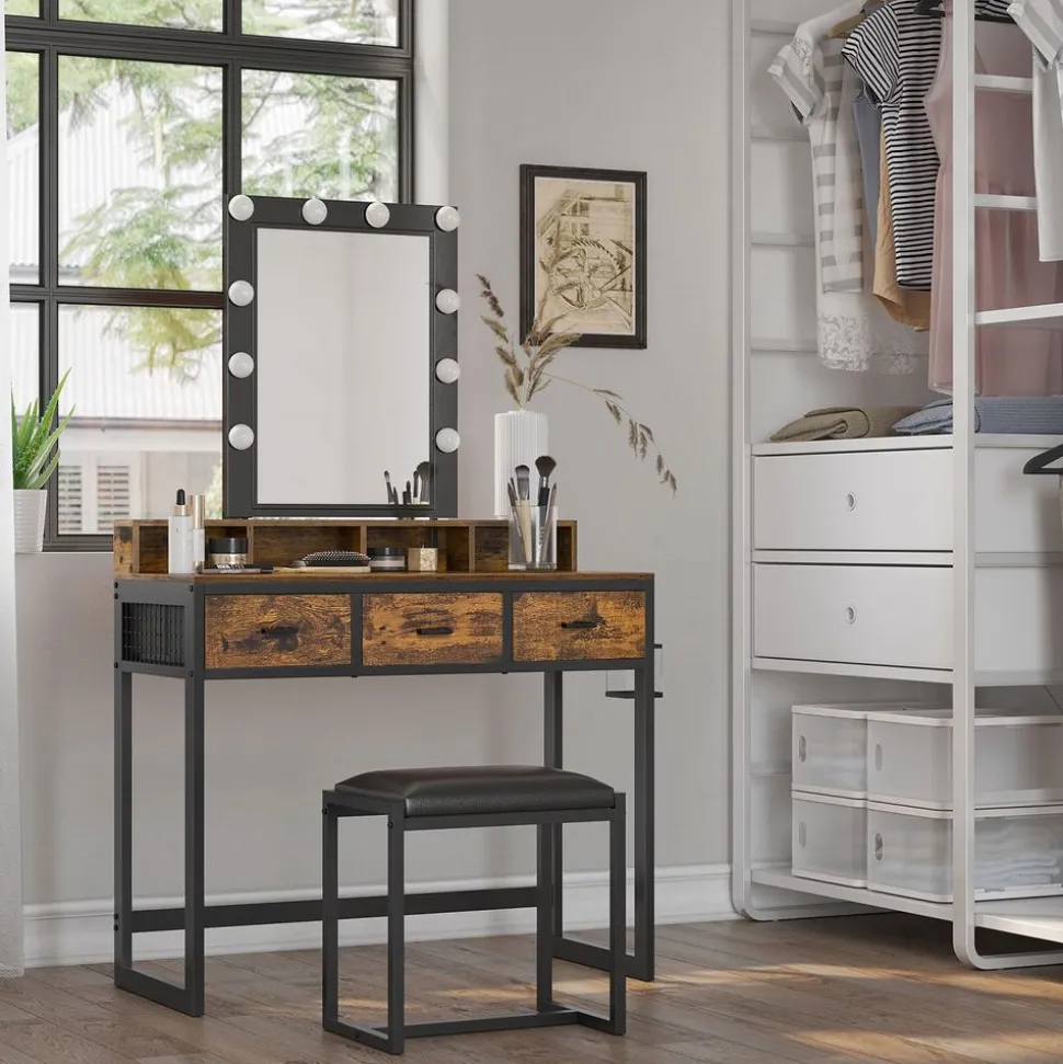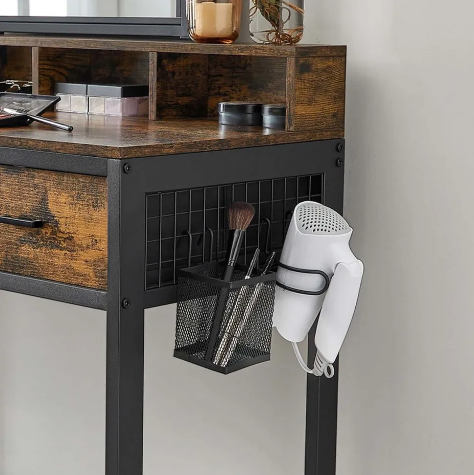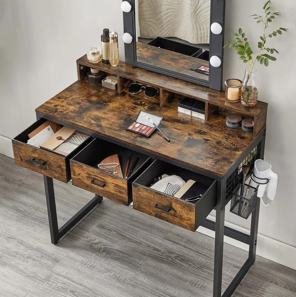 Avis aux personnes coquettes : Si vous souhaitez transformer votre dressing ou votre chambre en un paradis de beauté, cette coiffeuse marron rustique et noire de style industriel fera l’affaire ! Elle en dégage du glamour !
