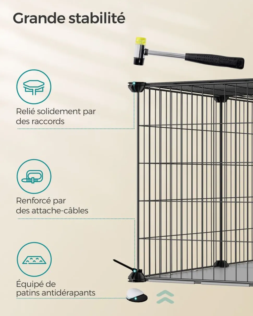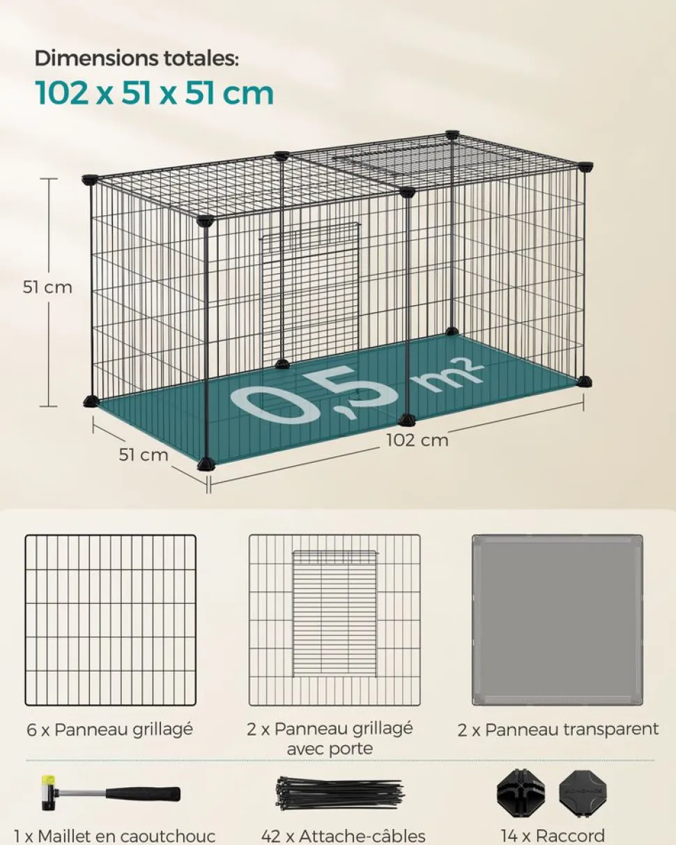 [Grande capacité et extensibilité] Cet enclos mesure 102 x 51 x 51 cm, offrant suffisamment d’espace d’activité pour vos petits animaux ; à mesure que le nombre d’animaux augmente, vous pouvez agrandir sa taille en ajoutant deux ou plusieurs lots d’enclos[Sûre et fiable] Cette cage pour animaux de compagnie est équipée de 2 verrous en forme de L, avec un dessus et une base, formant une cage fermée (espacement entre les fils de 2,2 cm), voilà une demeure sûre pour vos animaux de compagnie[Facile à nettoyer et pour interagir] Le dessus et le côté sont dotés d’ouvertures pour faciliter le nettoyage et l’interaction avec vos animaux domestiques ; le bas est doté de panneaux transparents, ce qui facilite le nettoyage[Facile à assembler] Utilisez simplement le marteau en caoutchouc fourni pour relier les panneaux et les raccords en plastique ABS, monter cette cage pour petits animaux est vraiment facile[Démontable et polyvalent] Retirez facilement la porte lorsque votre animal n’a plus besoin de restriction ; ou retirez le panneau grillagé du haut, cette cage pour animaux de compagnie se transforme en parc ou en niche pour petits animaux