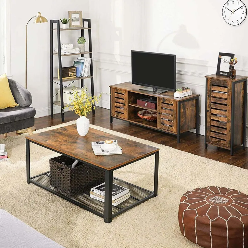 À CHACUN SA PLACE : Avec un dessus de meuble large et 2 tablettes ajustables cachées derrière la porte persienne, il y a beaucoup d’espace de rangement dans cette armoire spacieuse pour des films, des jeux, des bibelots et bien plus encore