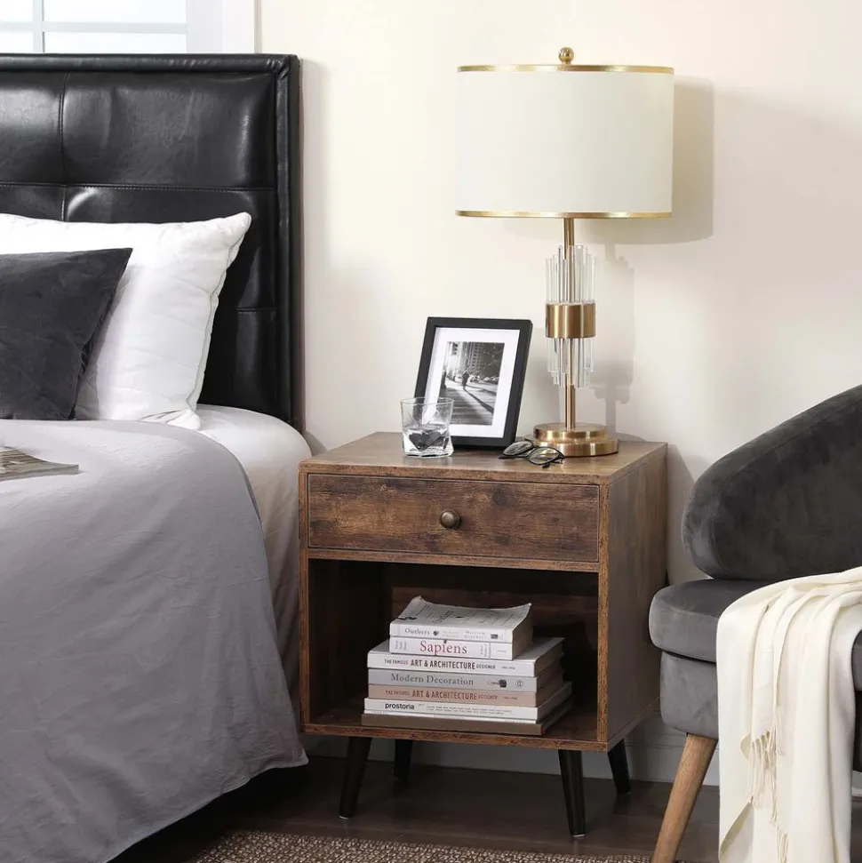 SUPPORTE, DISSIMULE ET DÉVOILE : Placez votre lampe de chevet à ambiance tamisée sur cette table de nuit, rangez vos secrets dans le tiroir et placez vos romans dans le compartiment ouvert. À chacun sa place ! Vous n’aurez plus besoin de vous lever quand vous êtes déjà au lit