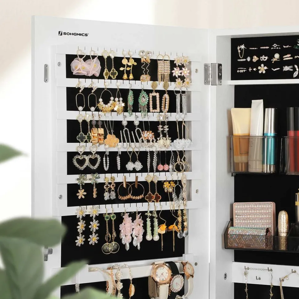 Un endroit où vos bijoux se sentent chez eux : Ne laissez pas vos cosmétiques et vos bijoux dans les tiroirs ou dans un coin prendre de la poussière ! Cet armoire à bijoux les montre comme dans une vitrine, et la serrure à double clé les protège à la fois de la poussière et des mains indiscrètes. Ils se sentiront immédiatement à l’aise dans ce coffret à bijoux sûr et raffiné !
