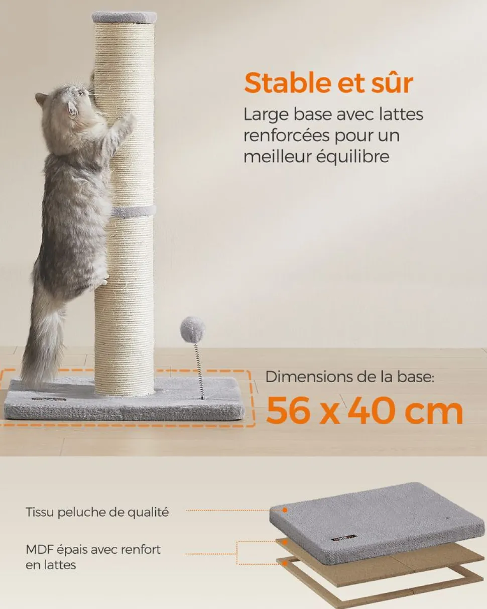 【BASE RENFORCÉE, MEILLEURE STABILITÉ】Avec sa base large de 50 x 40 cm renforcée par des lattes, ce poteau en sisal pour chat offre à votre petite boule de poils un endroit stable et sûr pour gratter, jouer et grimper, sans basculer