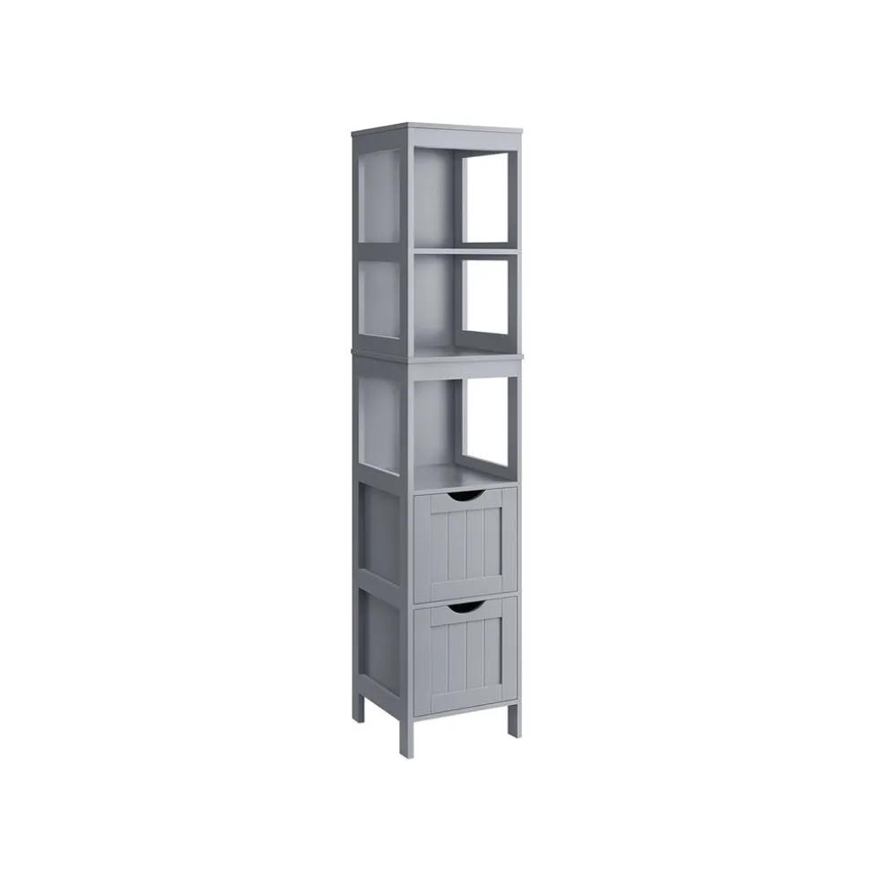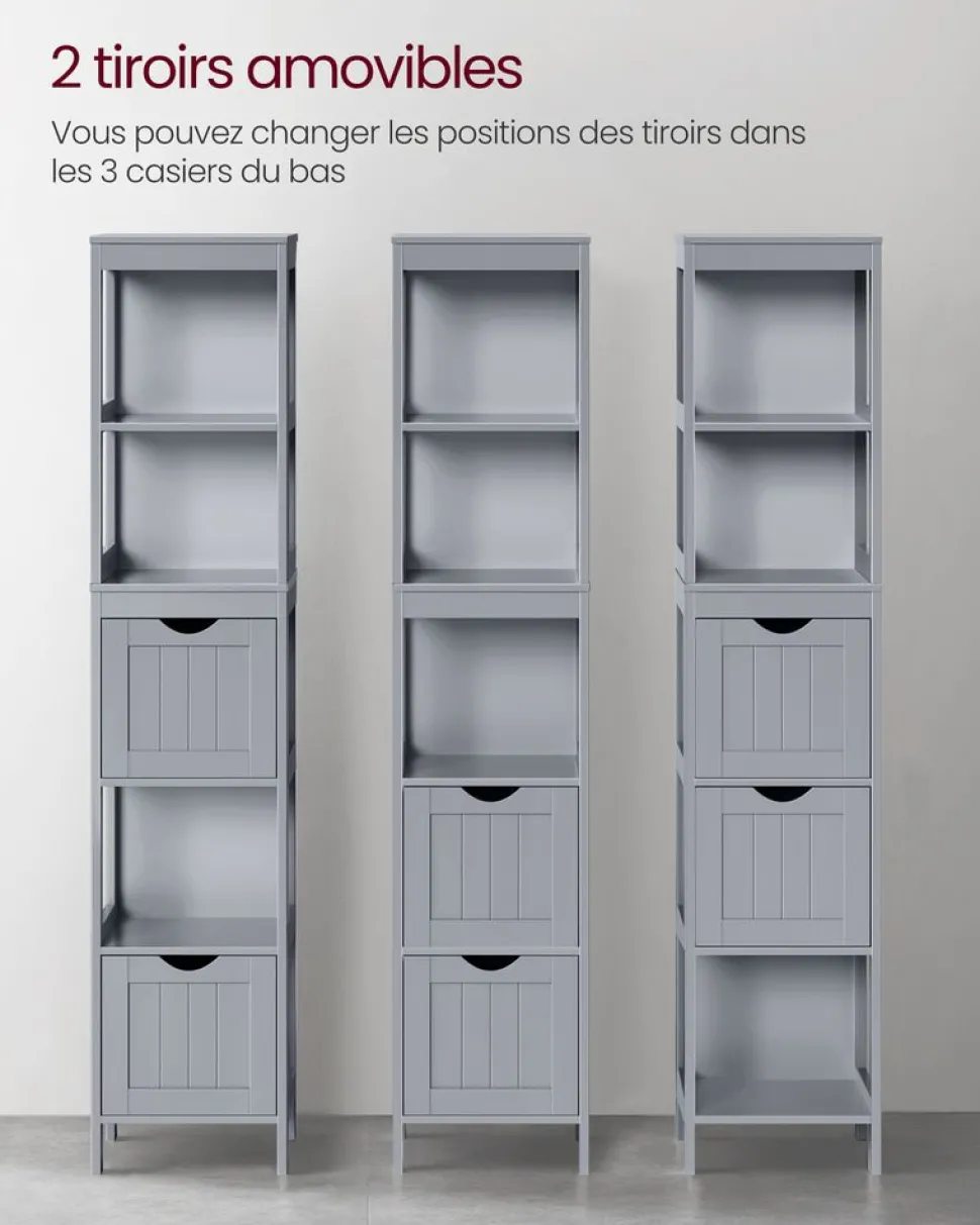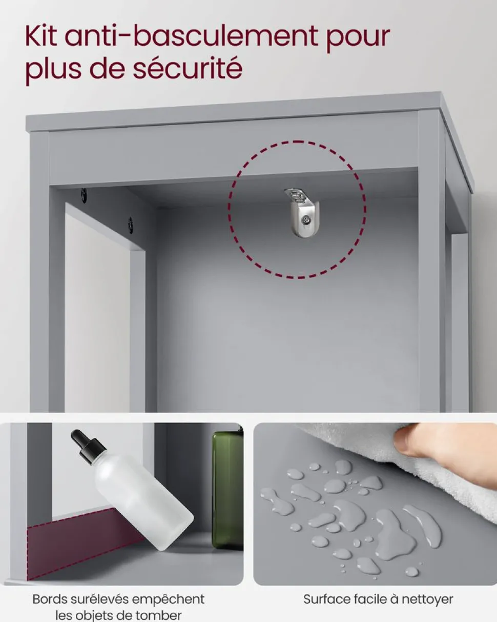 Ce que vous obtenez : Un meuble de salle de bain design et pratique. Voici une façon d’ajouter une touche de fraîcheur à votre salle de bain et de ranger vos affaires de manière ordonnée ![Précaution] Pour des raisons de sécurité, veuillez impérativement fixer le produit au mur avec le dispositif anti-basculement fourni