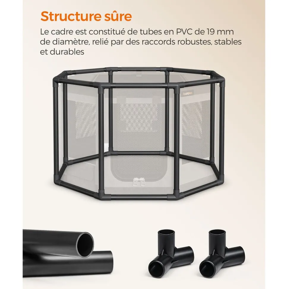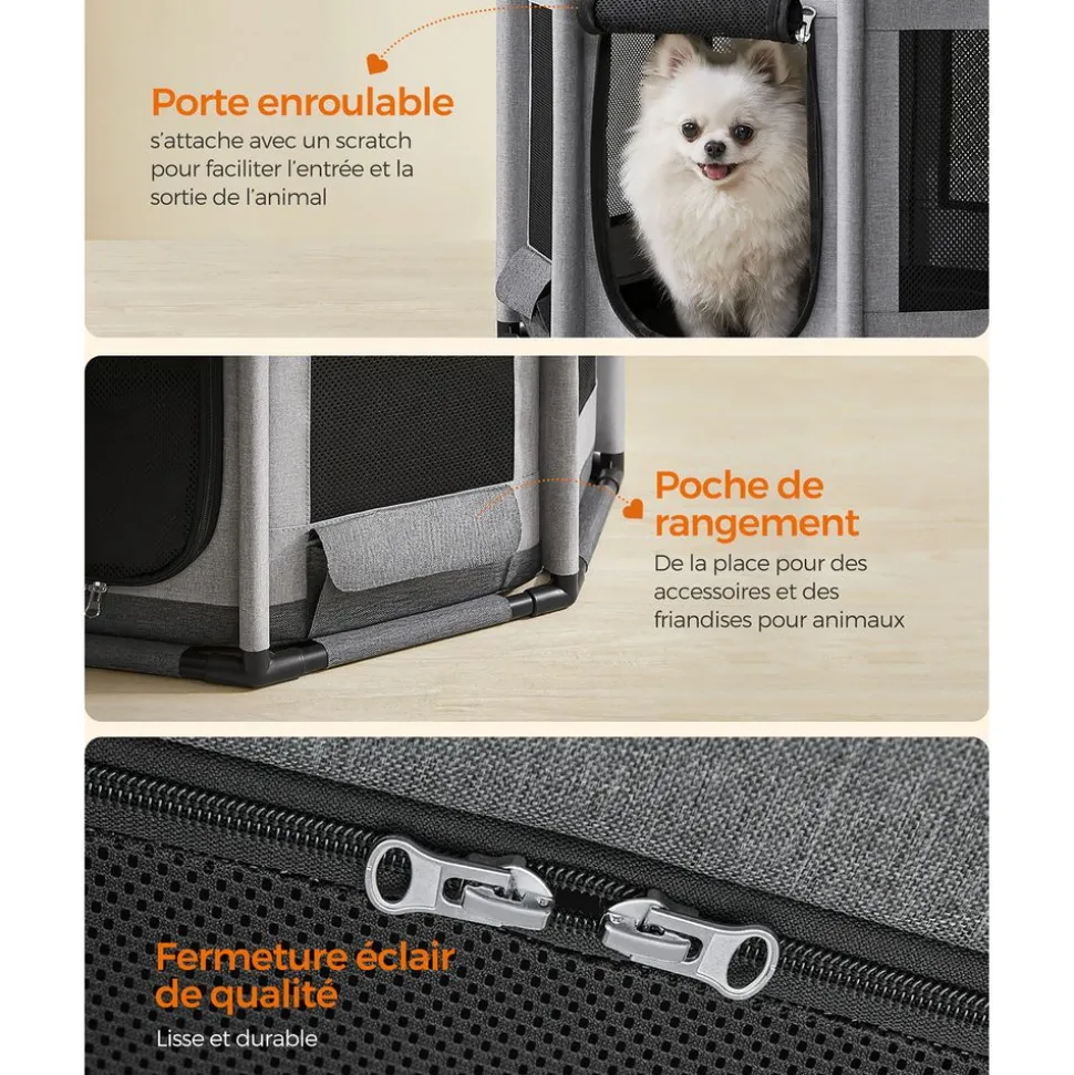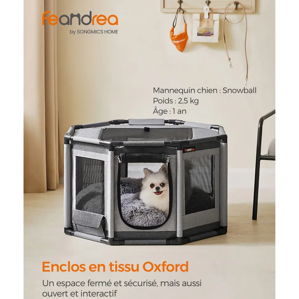 [Structure sûre] Cette clôture pour chiens est dotée d’un cadre robuste en tubes de PVC qui maintient la stabilité, même si votre chiot est très remuant à l’intérieur, il évite la déformation et sécurise l’environnement de votre animal[Résistant mais respirant] Les côtés de ce parc pour chien sont fabriqués en tissu Oxford 600D et en mailles serrées, résistants et durables, qui résistent aux morsures et aux coups de patte, la toile assure une bonne aération[Polyvalent] Cet enclos s’ouvre à l’aide d’une fermeture éclair en haut et sur un côté, il peut être un espace interactif ouvert ou un espace fermé et sûr. Doté d’une pochette, il est idéal comme niche, séparation, cage de mises-bas ou lieu de soins…[Large espace] Ce chenil de 72 x 72 x 43 cm convient aux chats et chiens de petite taille jusqu’à 11 kg comme le Yorkshire, le Poméranien, le Carlin, le Chihuahua, le Caniche nain, le Corgi, le Bouledogue français… Choisissez selon votre animal[Facile à nettoyer] Le fond de cette niche pour chien est hydrofuge, vous pouvez donc le nettoyer avec un chiffon ou un aspirateur, c’est un espace pratique à garder propre et hygiénique pour vous et votre animal