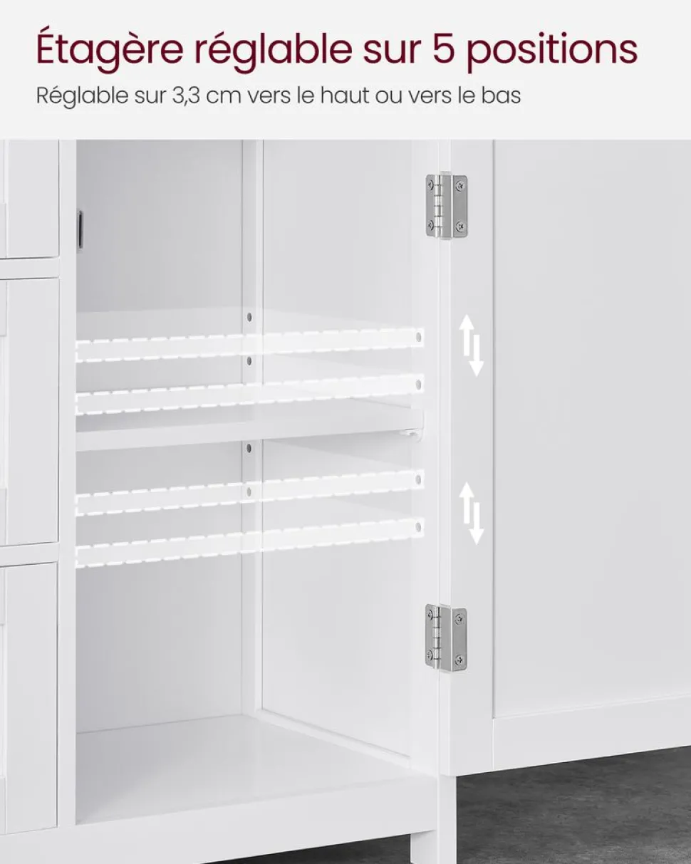 ÉLABORÉ AVEC SOIN : Fabriqué en panneau d’aggloméré de classe E1 de qualité, ce placard solide possède une surface laquée facile à nettoyer. En plus, sa finition est si bien travaillée qu’il n’y a aucun écart entre ses portes. Il a tout pour resplendir longtemps !