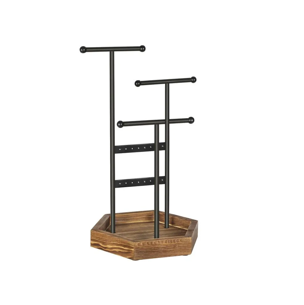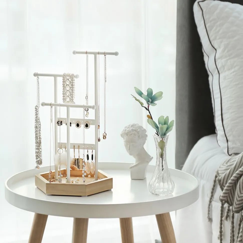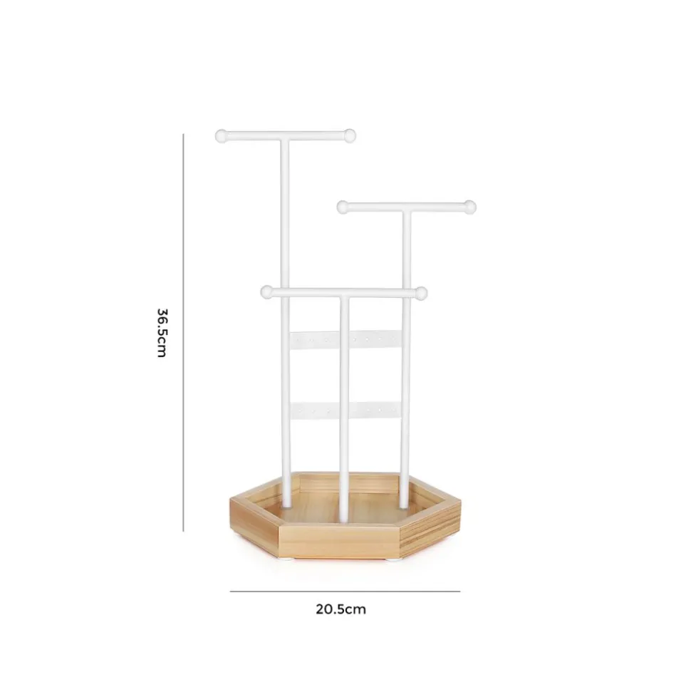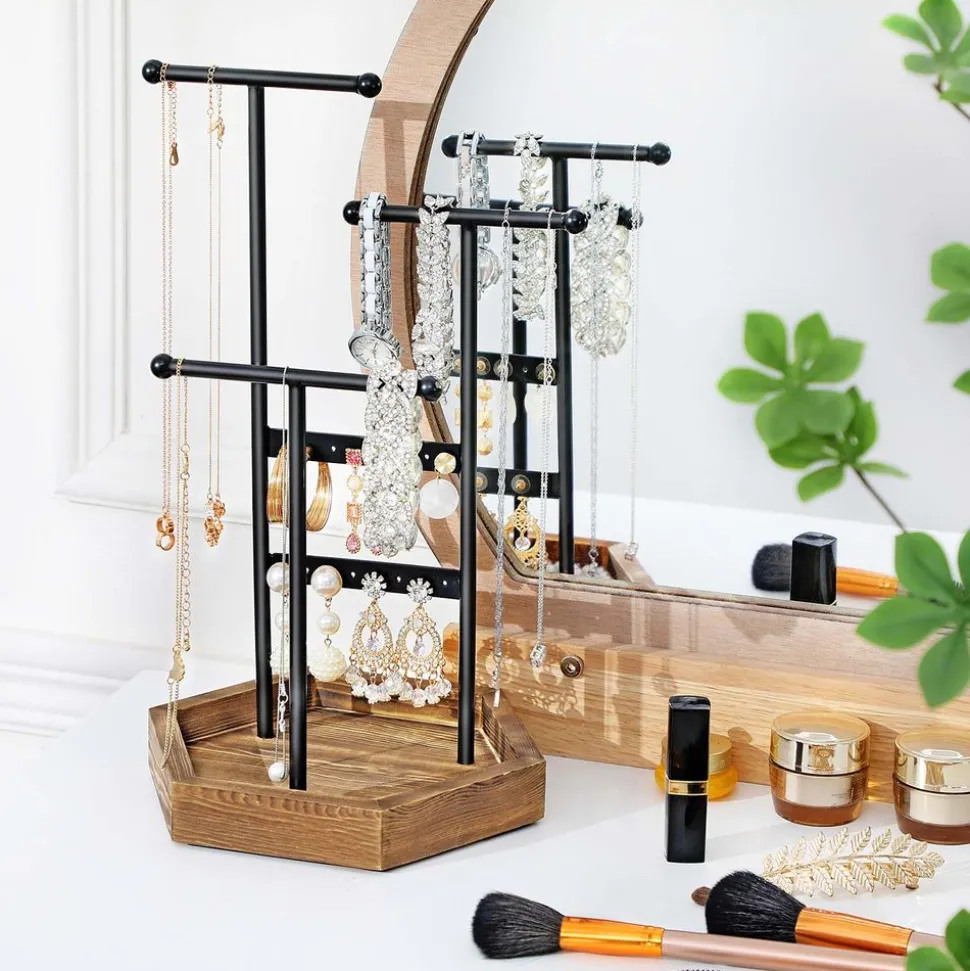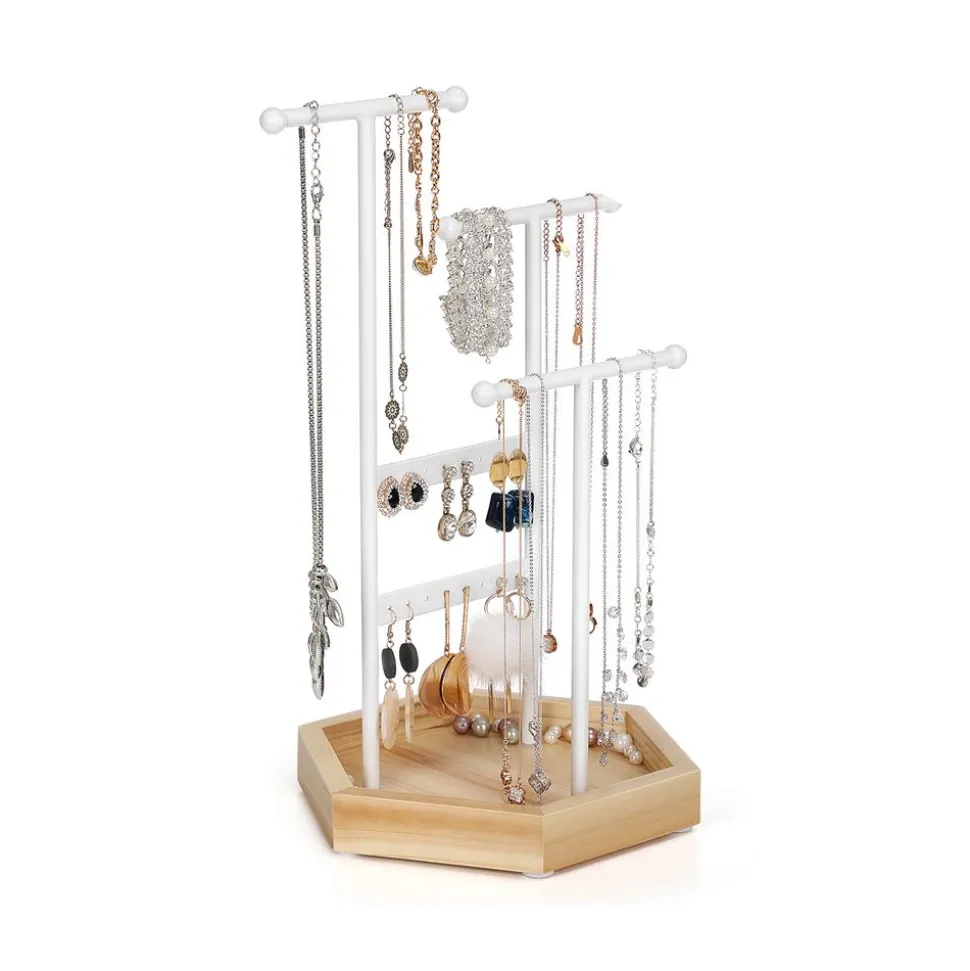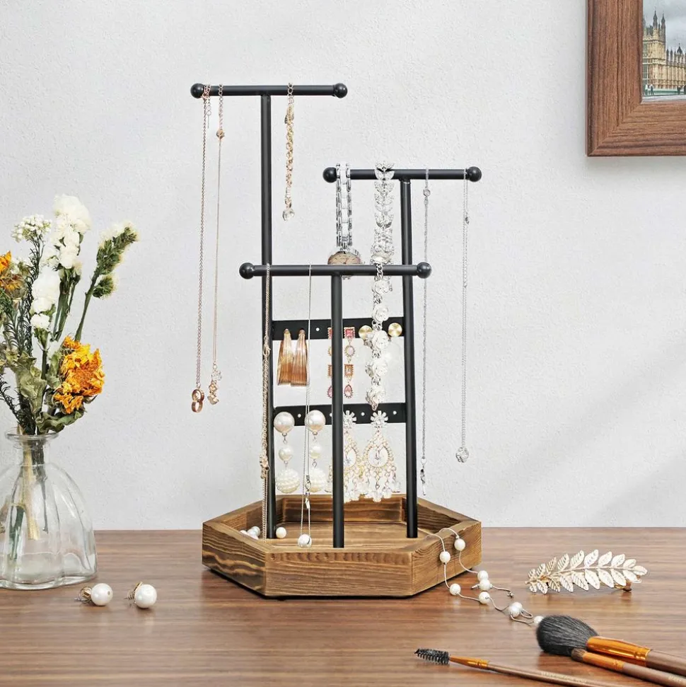 Organisation sur vos affaires : avec 16 trous, 3 tiges en forme de T de différentes hauteurs et la base en bois, vous pouvez toujours organiser vos boucles d’oreilles, bagues, bracelets, colliers et colliers longs