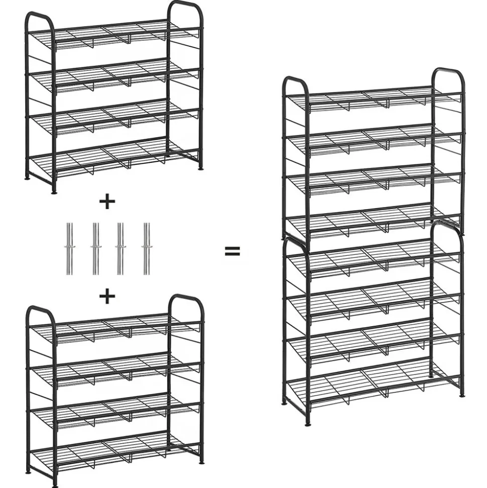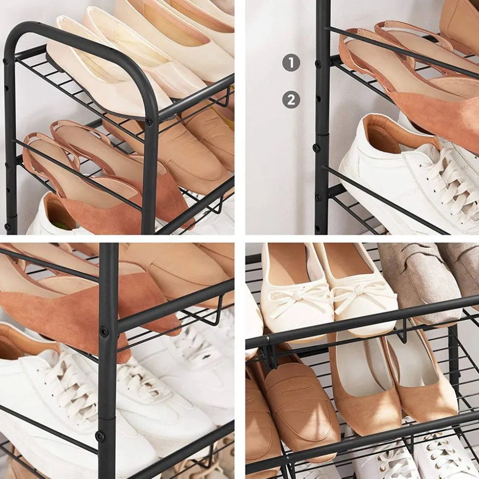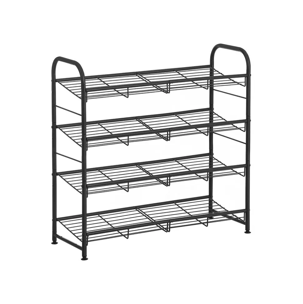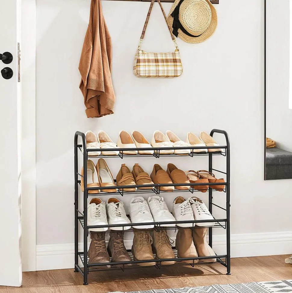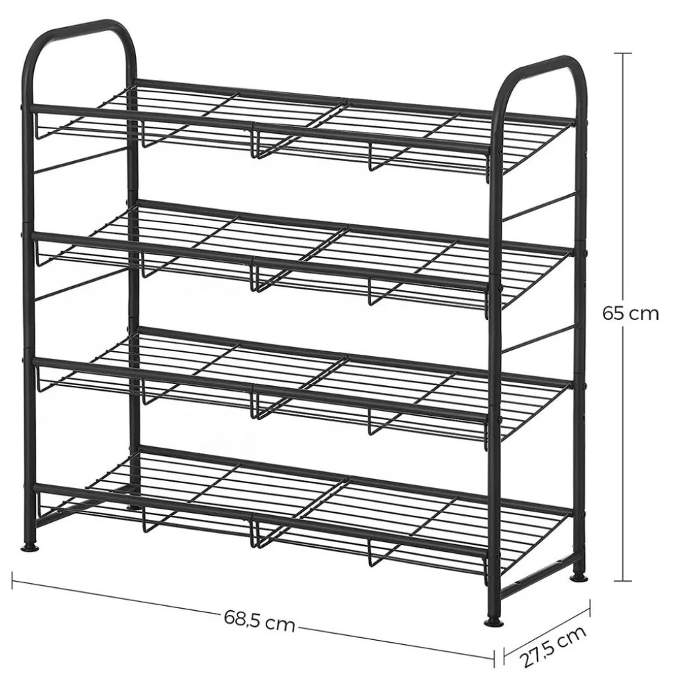 Ce que vous obtenez : Un porte-chaussures à 4 étagères avec un cadre robuste en métal. Vous pouvez l’utiliser pour ranger des chaussures dans l’entrée ou d’autres affaires dans la chambre, le dressing ou le garage