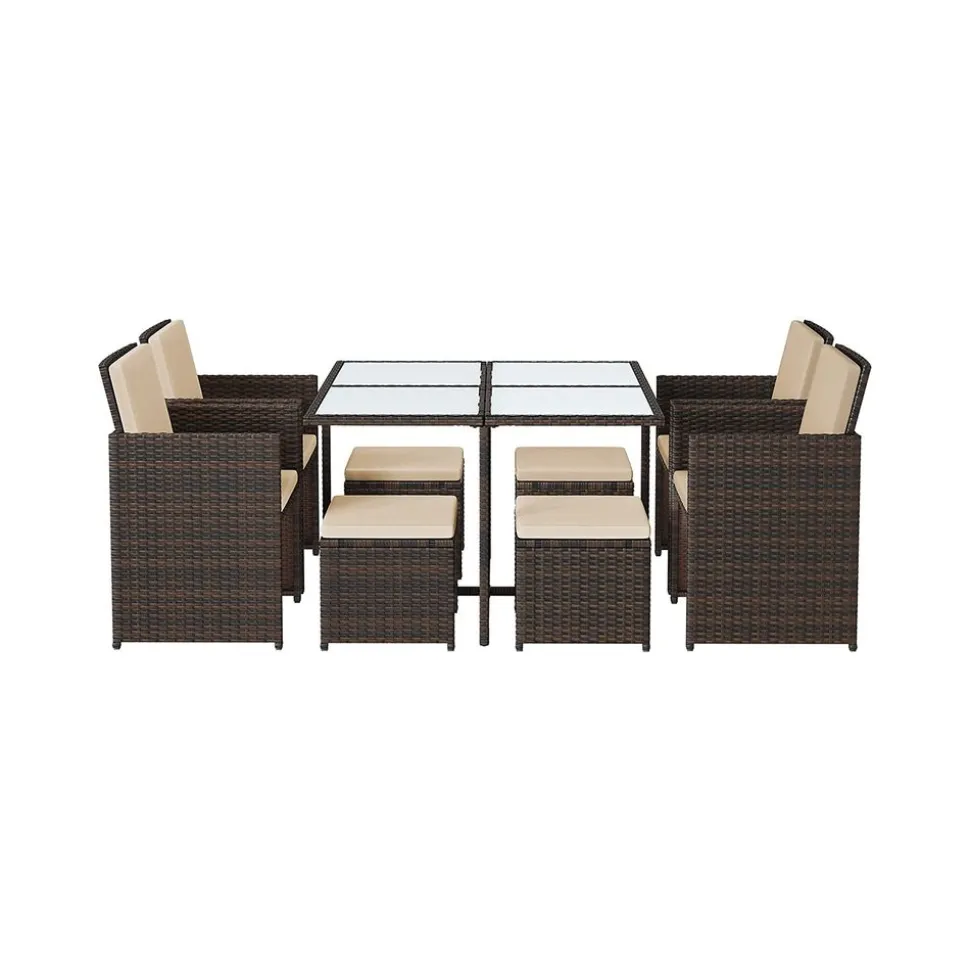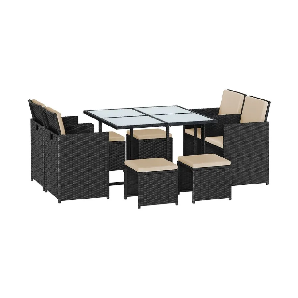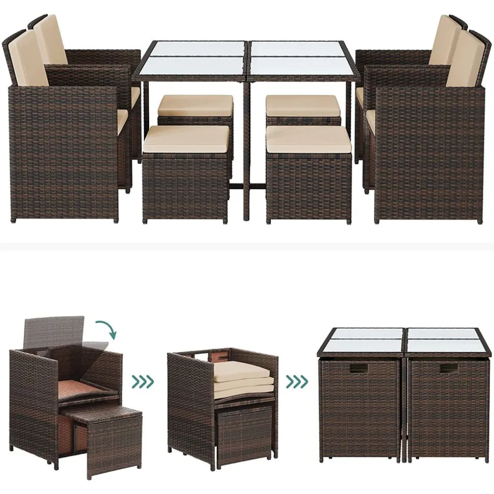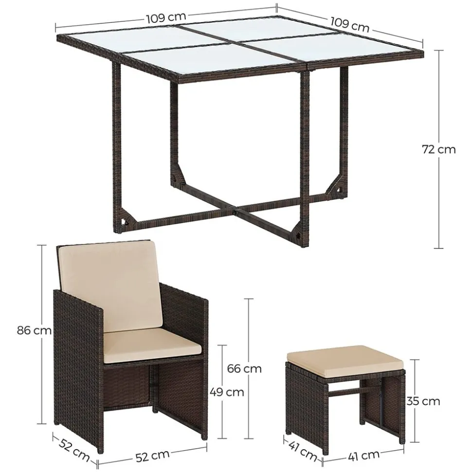 – Matériaux des meubles : Polyéthylène, acier traité par poudrage, verre trempé