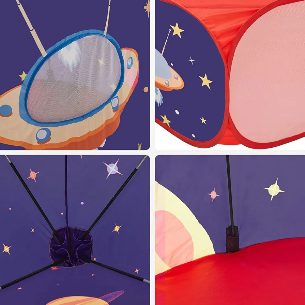 Du gâteau ! Les copains arrivent ? Ce parc sera monté avant même que le gâteau du goûté soit cuit. Pop-up, le tout se déplie super vite. Faîtes glisser les tiges dans le tunnel et la tente et reliez les 3 éléments grâce aux attaches et scratchs. Done !