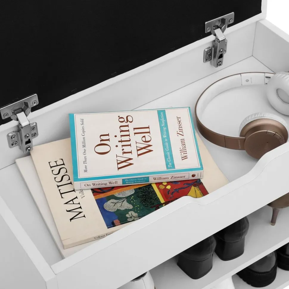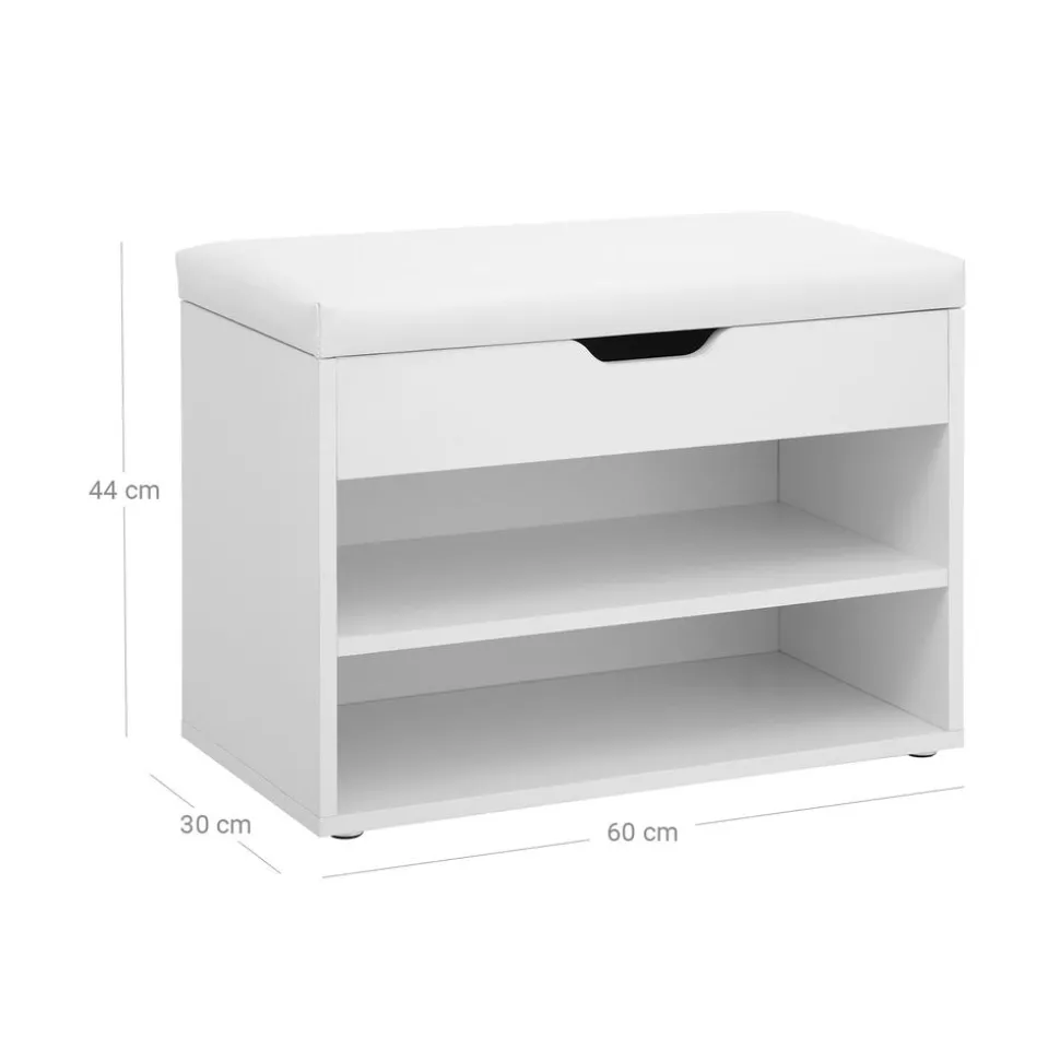 2 étagères pour ranger vos chaussures; 1 grand compartiment sous le coussin pour mettre les brosses à chaussure, cirages, clés, gants, écharpes, etc.