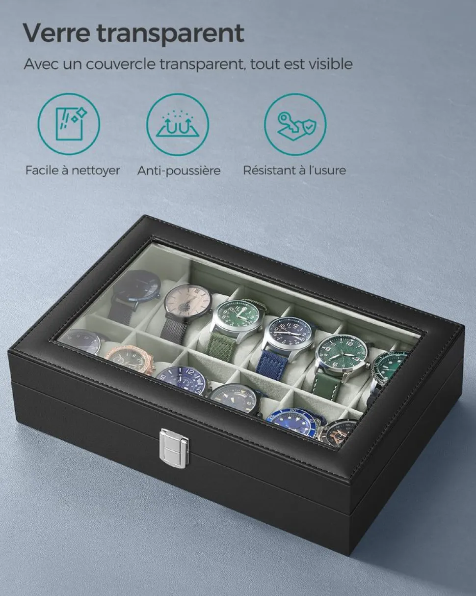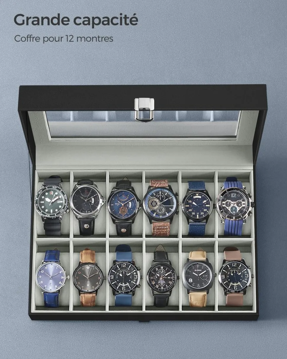 Donnez vie à votre collection : Vous êtes un collectionneur de montres ? Chaque fan de montres a besoin d’un présentoir pour ses bijoux. Cette élégante boîte à 12 compartiments accueille chaleureusement votre collection