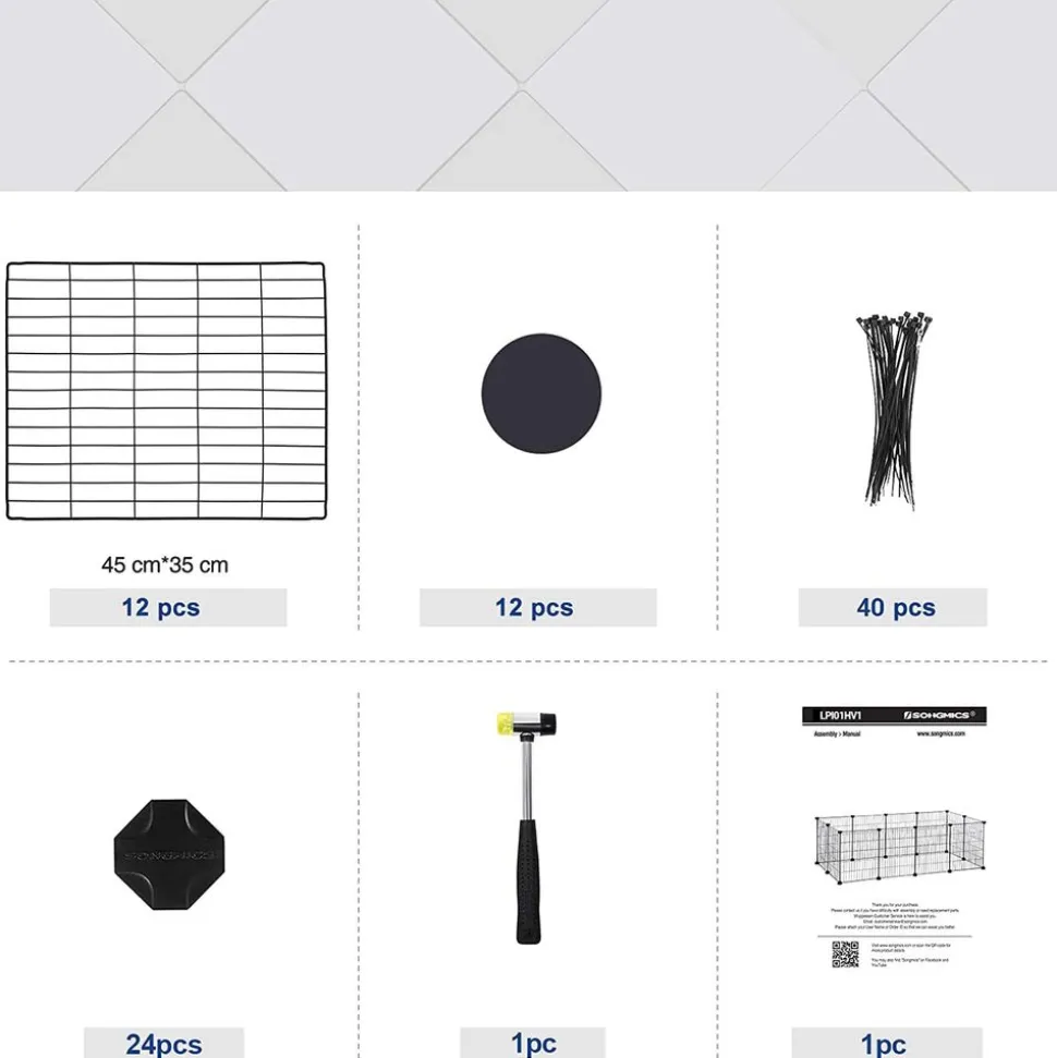 Les animaux domestiques sont des membres de la famille: Nous avons créé une clôture que vous pouvez personnaliser à votre guise. Avec 12 panneaux grillagés métalliques (35 x 45 cm chacun) et 24 connecteurs en plastique ABS, vous avez le choix entre différentes configuration de montage. Placez des jouets, un lit et de l’eau pour créer un royaume où votre animal peut se sentir comme un roi.