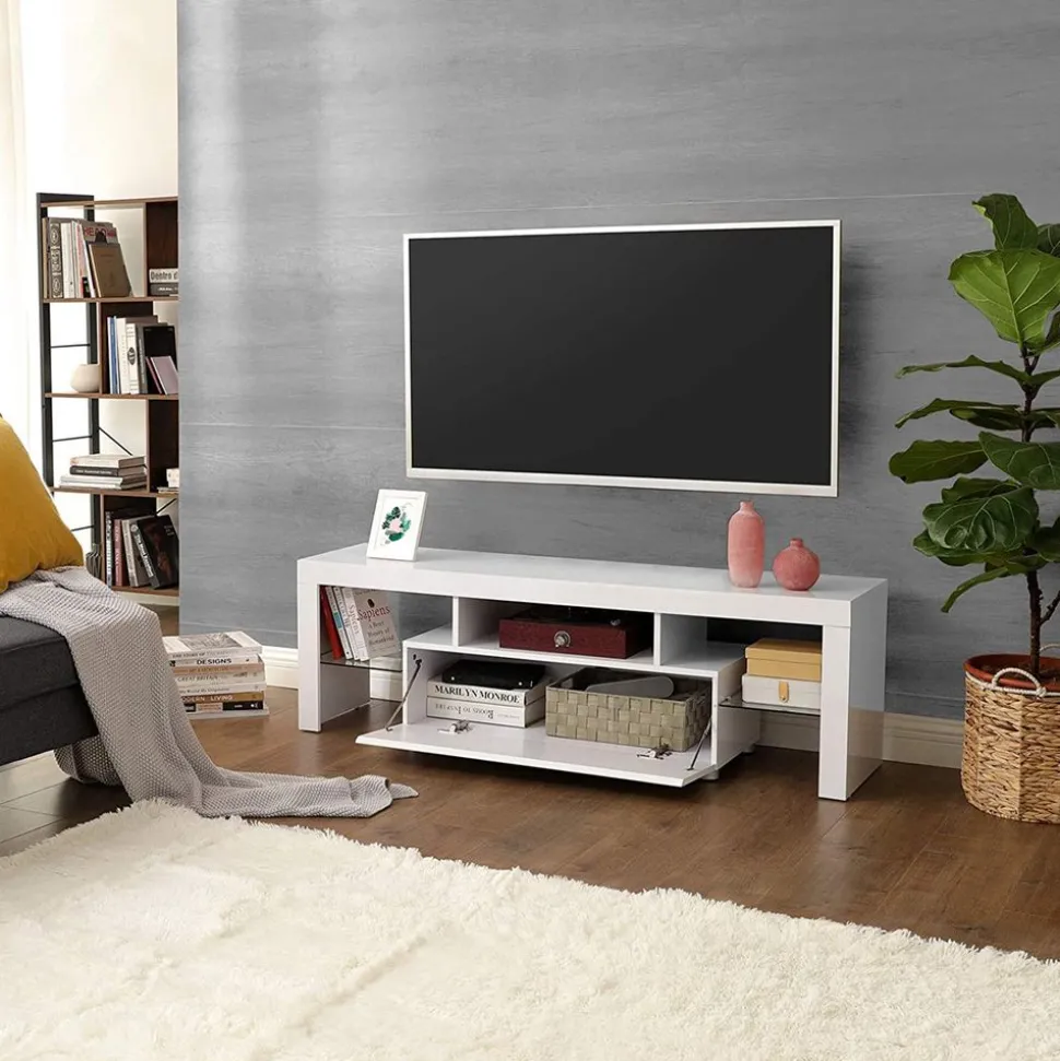 BANDES LUMINIEUSES À LED : Mettez votre téléviseur en lumière avec la surface blanche brillante de ce meuble TV et donnez une touche de modernité à votre coin TV. Collez les deux bandes lumineuses fournies n’importe où sur le panneau du téléviseur et laissez-le briller dans des couleurs vives néon
