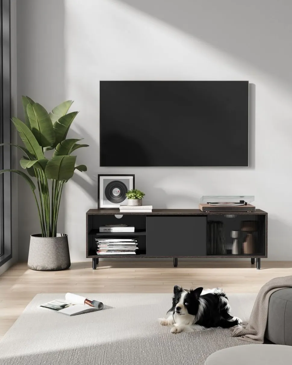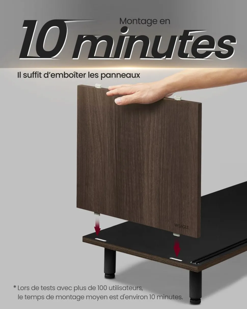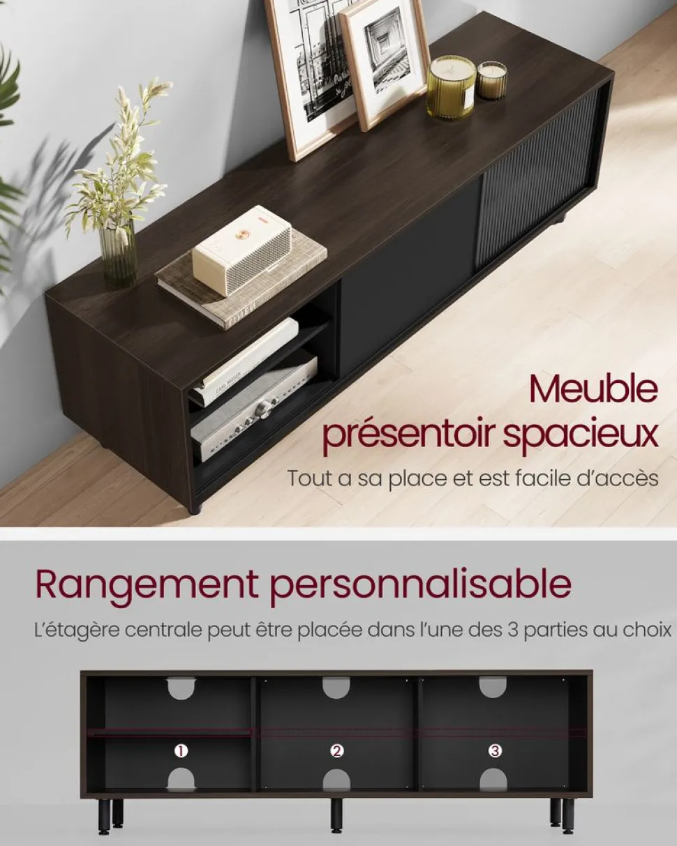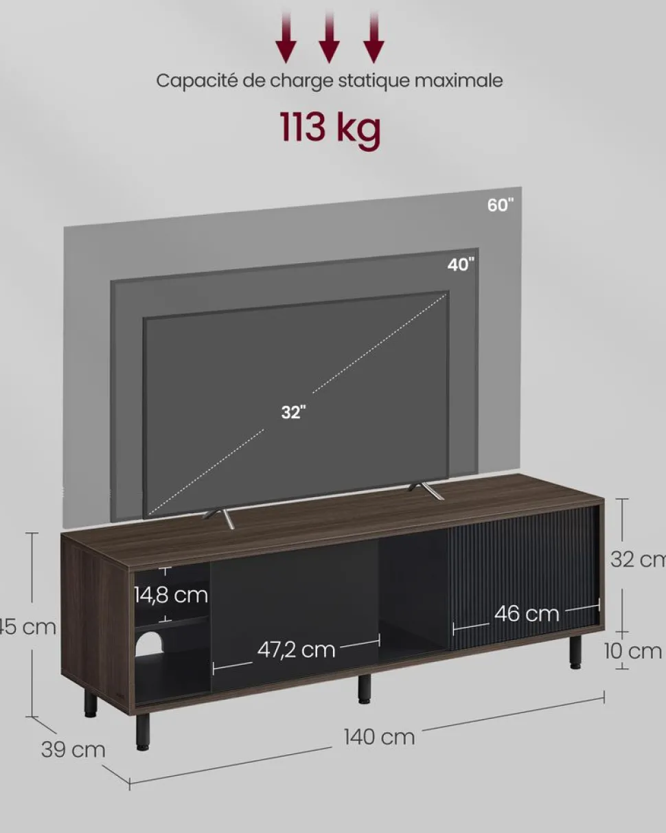 [Support robuste] Sa surface de 147 cm convient aux téléviseurs jusqu’à 65 pouces. Fait en panneaux d’aggloméré et en acier, ce meuble TV avec rangement supporte jusqu’à 91 kg au total[3 options de rangement] 2 étagères réglables derrière les portes, 2 compartiments ouverts séparés par une étagère réglable et une étagère ouverte sous le plateau. Voilà suffisamment de place pour vos jeux, films et appareils multimédias[Style industriel] Avec ses 2 portes imitation grange, ses cadres en X et sa couleur marron rustique, ce meuble télé dégage une vibe industrielle. Il est clairement la star de votre salon[Facile à assembler] Des instructions illustrées et des pièces numérotées facilitent l’assemblage de ce meuble TV[Fonctionnalités pratiques] Les portes de l’armoire sont bien maintenues en place. Les 2 trous pour les câbles aident à garder les fils sous contrôle. Les pieds réglables assurent une bonne stabilité, même sur un sol légèrement irrégulier