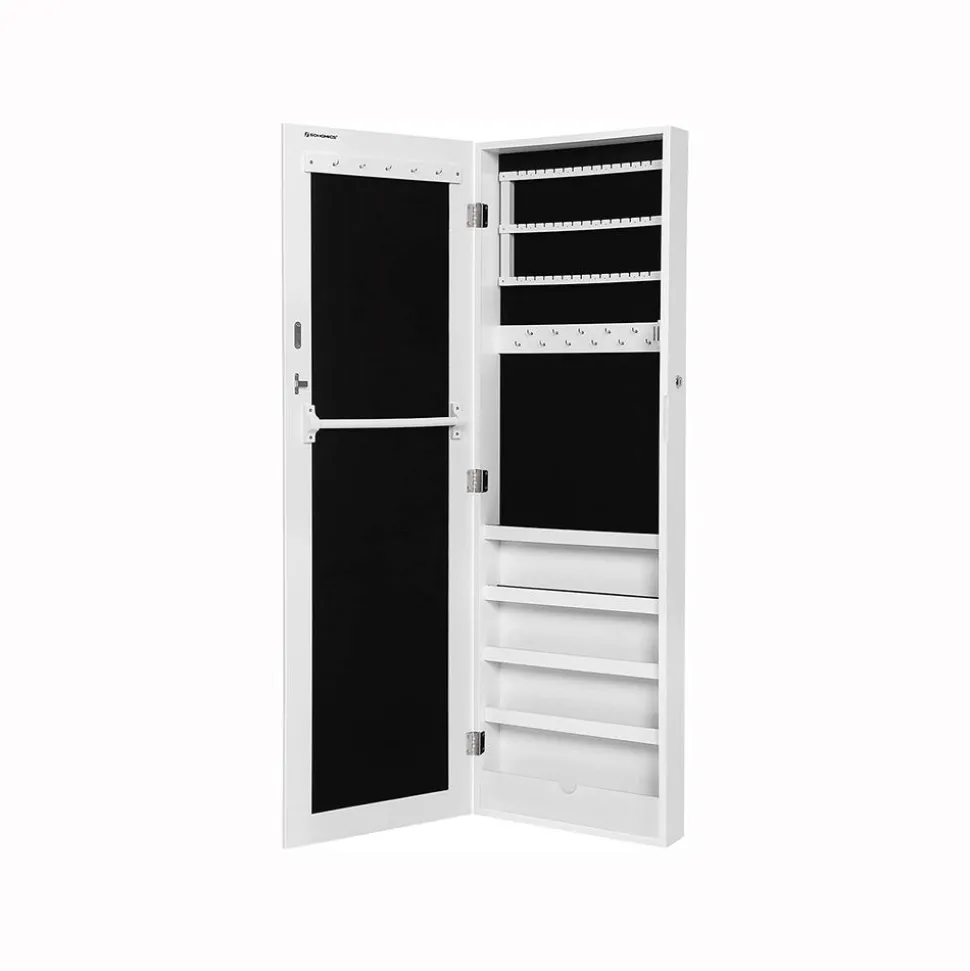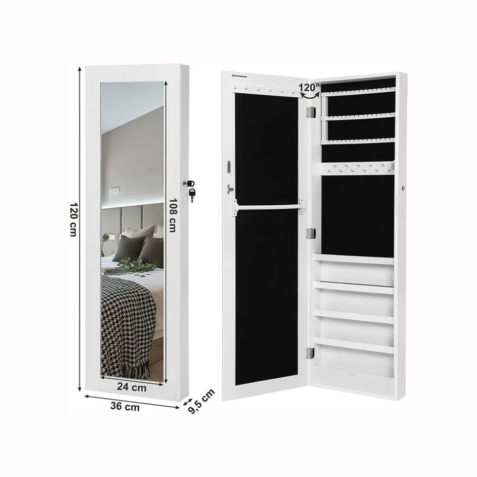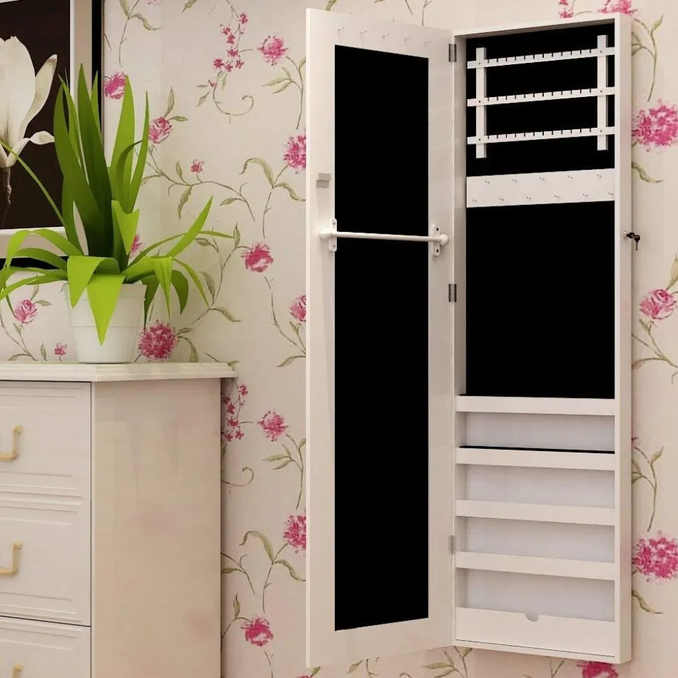Cette armoire à bijoux avec miroir est un produit idéal et sécurisé pour ranger tous vos bijoux et accessoires de beauté. Très élégante avec sa couleur, l’armoire sera parfaite dans une chambre, le dressing, les boudoirs, les garde robes ou les couloirs. Elle dispose des crochets et des petites étagères pour contenir toute votre collections de bijoux, de lunettes, etc. Vous aurez aussi de la place pour ranger vos plus beaux foulards et écharpes. Elle peut être fixé au mur pour gagner des places et s’adapte à la petite maison.
