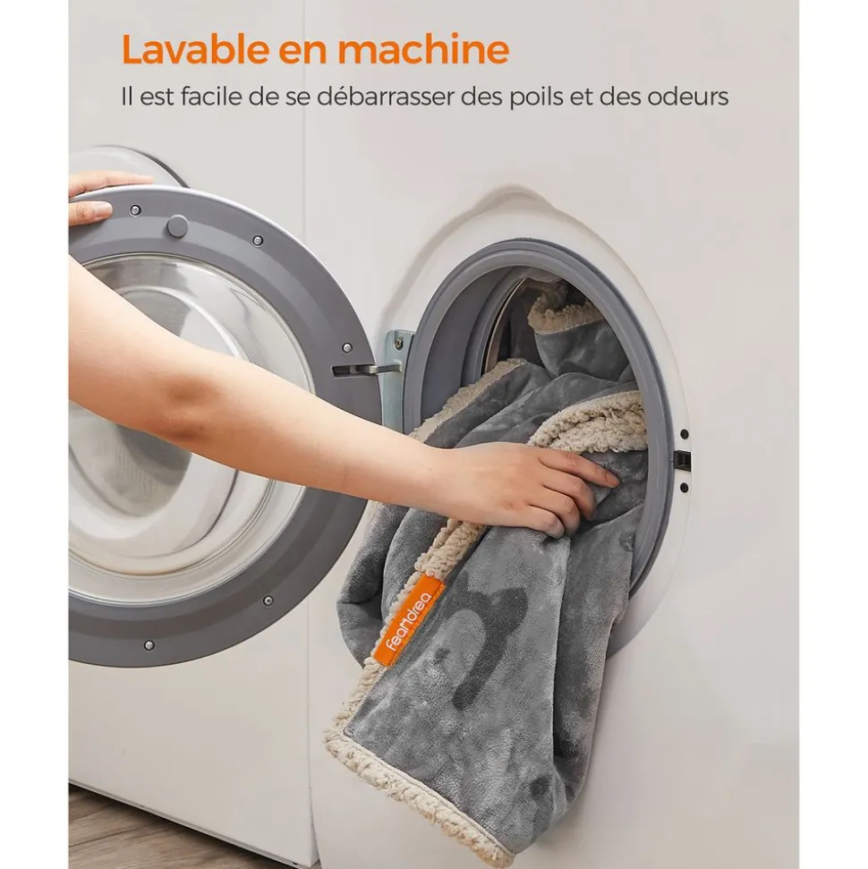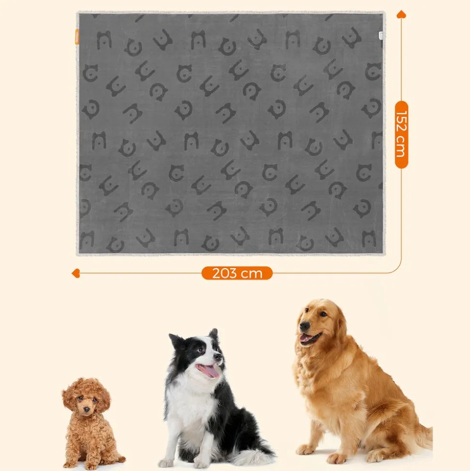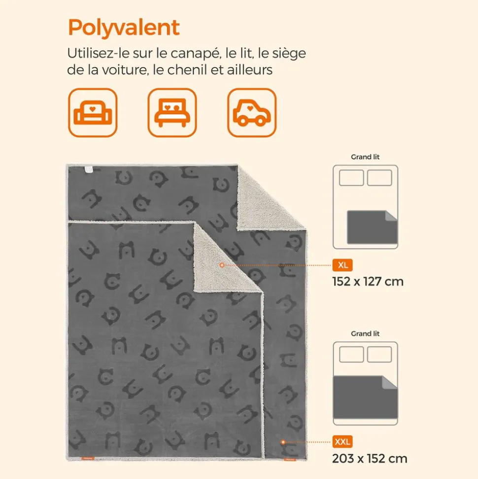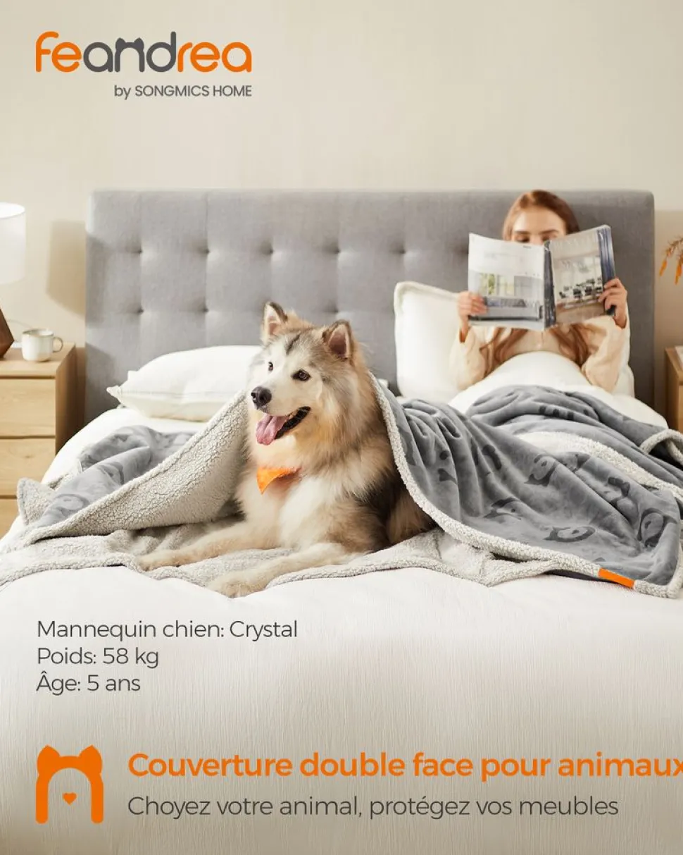 [Hydrofuge] Avec une couche TPU hydrofuge, cette couverture empêche les liquides de passer à travers et protège votre canapé ou votre lit des mauvaises surprises et des pattes sales[Le confort partout] Un côté est en tissu polaire, l’autre est en tissu flanelle. Les 2 côtés sont agréables au toucher. Voici un endroit confortable pour se détendre sur le sol, dans une cage ou sur un siège de la voiture[Pas de glissement, plus de sécurité] Les différentes couches sont attachées ensemble, les couches ne glissent pas, votre toutou est en sécurité et bien en place (en plus, pas de bruit !)[Joli et large] Avec une couleur neutre et un logo mignon FEANDREA, ce tapis s’harmonise avec votre décor. Avec une taille de 203 x 152 cm, cette couverture large couvre plus d’espace et offre plus de protection à vos meubles[Facile à nettoyer et à transporter] Cette couverture hydrofuge est lavable en machine (lavage à l’eau froide ; séchage en machine à basse température), il est facile de garder la vie de votre chien propre. Très légère, vous pouvez l’emmener en voyage ou au camping