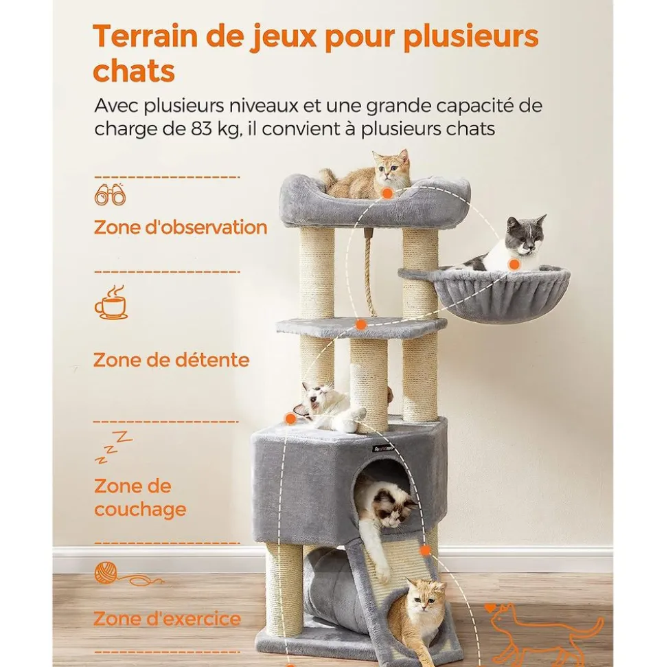 [Espace XXL] Cet arbre à chat est équipé d’une grandeplate-forme de 50 x 50 cm, une large niche de 50 x 50 x 30 cm et un hamac XXLde 40 cm. Il est particulièrement adapté aux grands chats[Robuste et stable] Avec une grande base de 50 x50 cm, des poteaux épais de 11,5 cm de diamètre et des barres de renfort, cettetour de jeux est stable même quand vos chats bondissent. Le kitanti-basculement le fixe au mur pour encore plus de sécurité[Pour 5 chats au maximum] Ce meuble pour chatsupport jusqu’à 83 kg au total. Avec plusieurs niveaux, vos chats peuventobserver la maison sur la plate-forme, faire la sieste dans le hamac ou segriffer sur les poteaux en sisal et sur le griffoir[Facile à nettoyer et à assembler] La housse dela plate-forme d’observation est amovible et lavable. Toutes les vis sontidentiques, même pas besoin de les différencier. L’assemblage se fait par uneseule personne à l’aide de la clé Allen fournie[Terrain de jeu, plaisir sans fin] Avec uneniche, une planche à griffer avec un trou, une corde en sisal suspendue, unhamac et une plate-forme, cet arbre à chat offre un plaisir sans fin à vos amisfélins