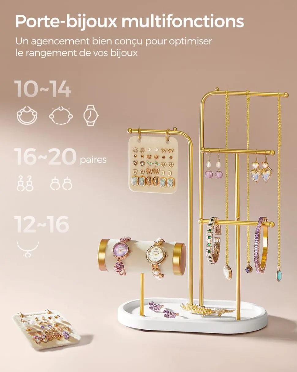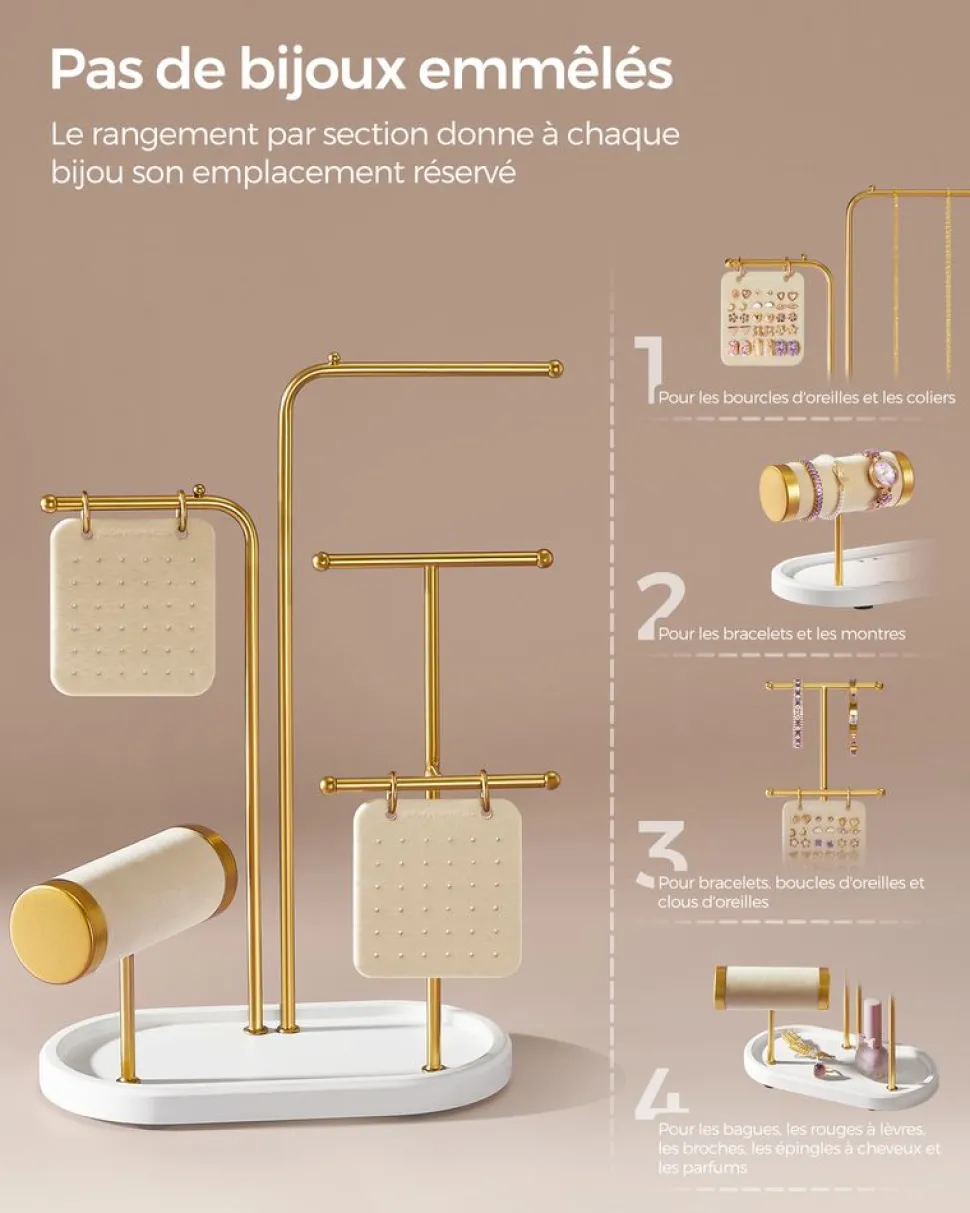 [Simple mais élégant] Présentant un mariage classique d’or et de blanc, complété par un cadre en acier, ce porte-bijoux n’est pas seulement un organisateur pratique, mais une décoration. C’est le cadeau idéal pour vos proches ou pour vous faire plaisir[Rangement des bijoux par section] Cet organisateur de bijoux comprend 2 plaques de présentation des boucles clous, 4 tiges de différentes hauteurs et un plateau en bas, qui vous permettent de ranger vos divers accessoires et de les garder à portée de main[Robuste, stable et durable] Ce porte-bijoux, fabriqué en acier résistant et renforcé par un socle en MDF durable, assure un maintien sûr et stable à vos objets précieux et les protège des chocs accidentels[2 plaques pour boucles d’oreilles adaptables] Cet élégant présentoir comprend 2 plaques adaptables à 36 trous. Vous pouvez facilement les accrocher à différentes tiges. Idéales pour les voyages, et vous permettent de bien ranger vos boucles d’oreilles[Assemblage facile] L’assemblage de votre support à bijoux est simple comme bonjour ! Fixez le cadre en acier à l’aide des vis fournies. C’est ainsi qu’il est prêt à exposer votre collection de bijoux préférée