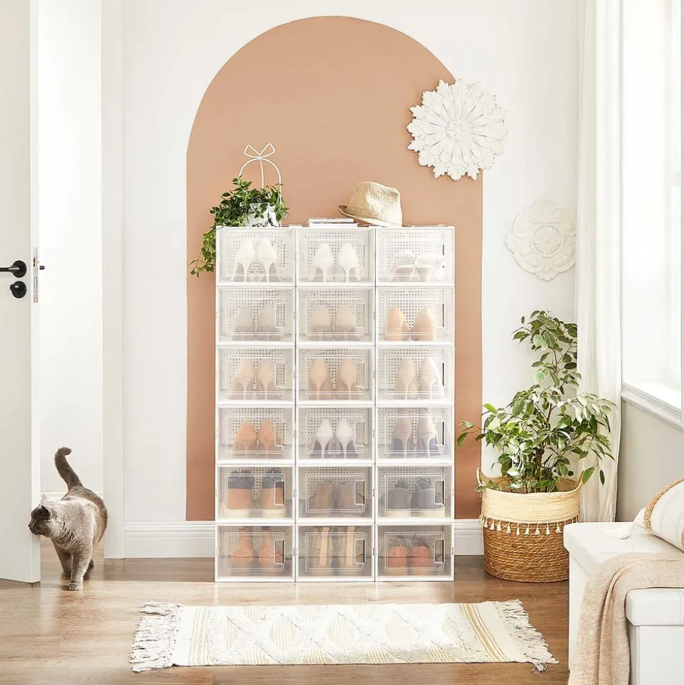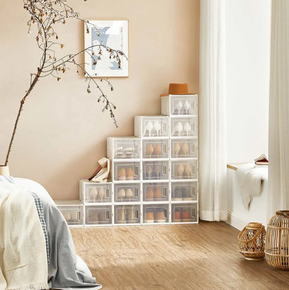 Empiler ou aligner : Envie d’une tour de rangement de chaussures ? Facile ! Empilez les boîtes les unes sur les autres ou connectez-les côte à côte à l’aide des connecteurs en plastique inclus, vous créerez une tour stable pour votre collection