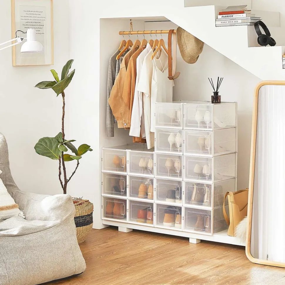 Quelle paire voulez-vous ? Les boîtes transparentes vous permettent de vite repérer la paire de chaussures. Grâce à la porte frontale, les chaussures sont facilement accessibles