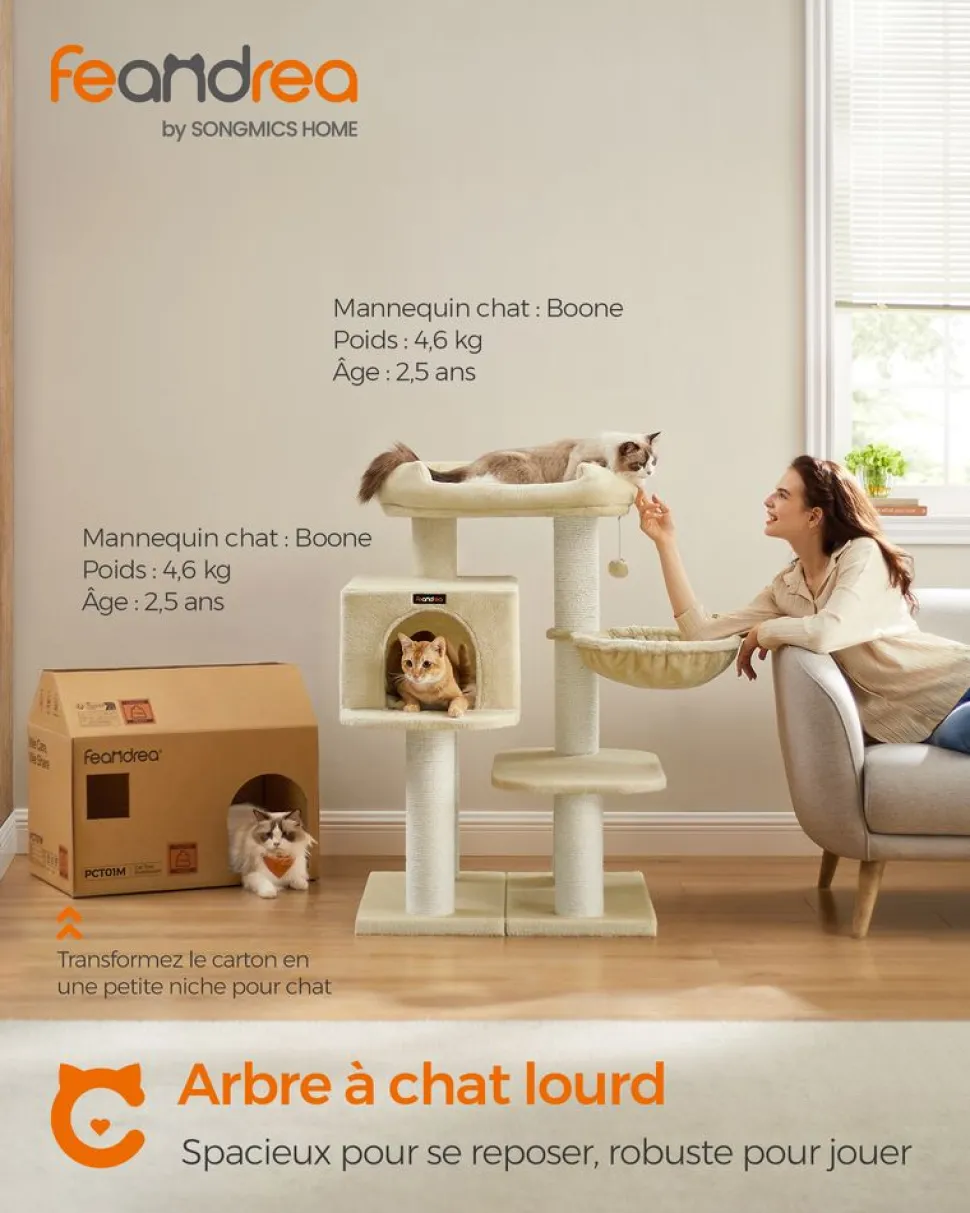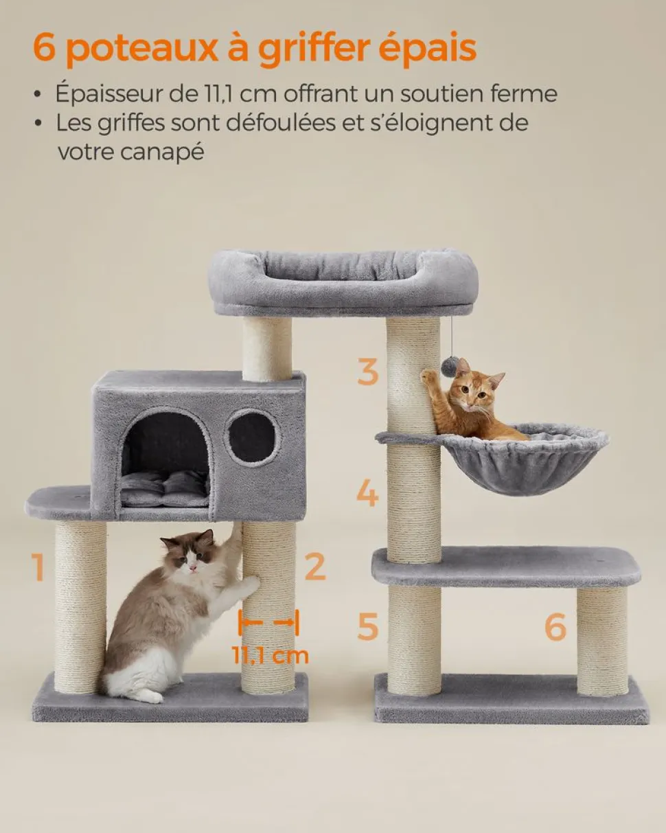 FAIT POUR DURER: Que ce soit un Ragdoll musclé ou un grand Savannah qui féline dans votre appartement, la sécurité est toujours prioritaire. La base est renforcée par une double couche de panneaux d’agglomérés. Des dispositifs anti-basculement sont fournis, et les troncs épais en sisal (diamètre 8,6 cm) assurent une excellente stabilité