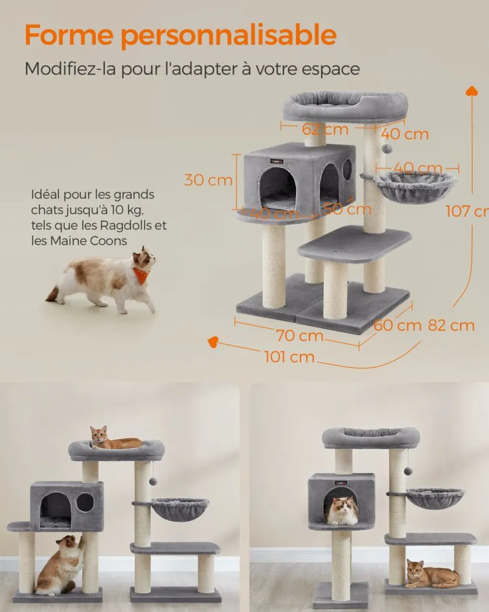 L’angleentre 2 parties de l’arbre à chat est personnalisable. Cet arbre à chats’intégrera parfaitement chez vous. Si vous aimez ce produit, n’hésitez pas àpartager vos opinions avec d’autres amoureux des animaux dans les commentaires!