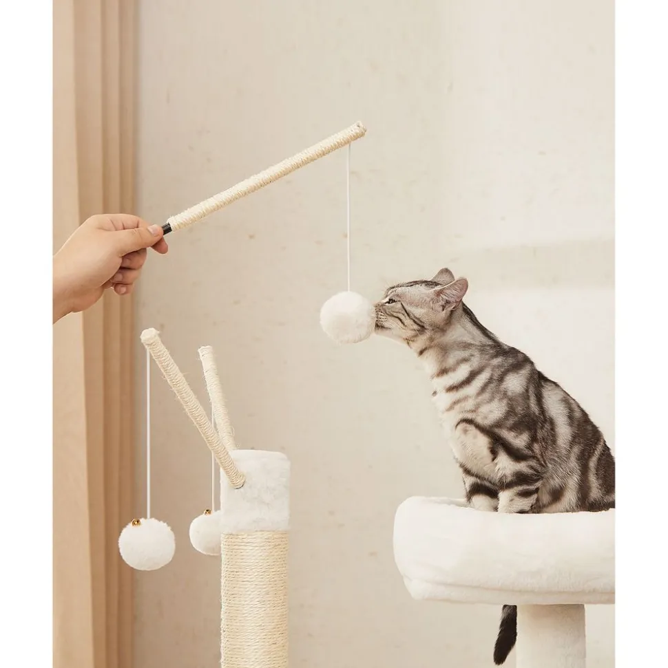 Plaisirs et confort sans fin : Avec 3 baquettes à pompons amovibles, des griffoirs, un plate-forme bien rembourrée, une niche et un panier, vos chats ne s’ennuieront pas sur cette tour à chat