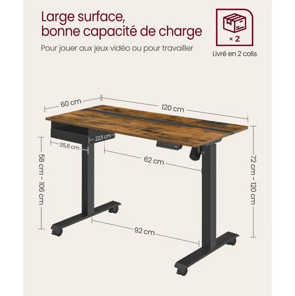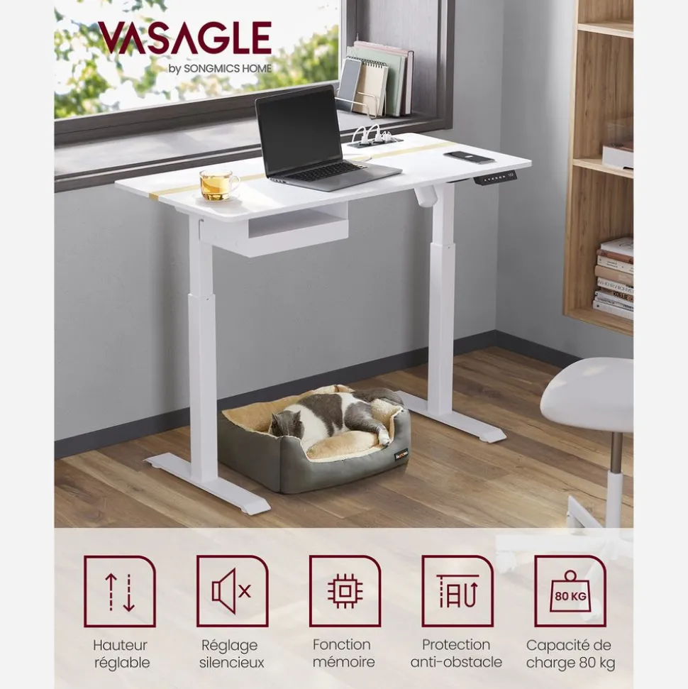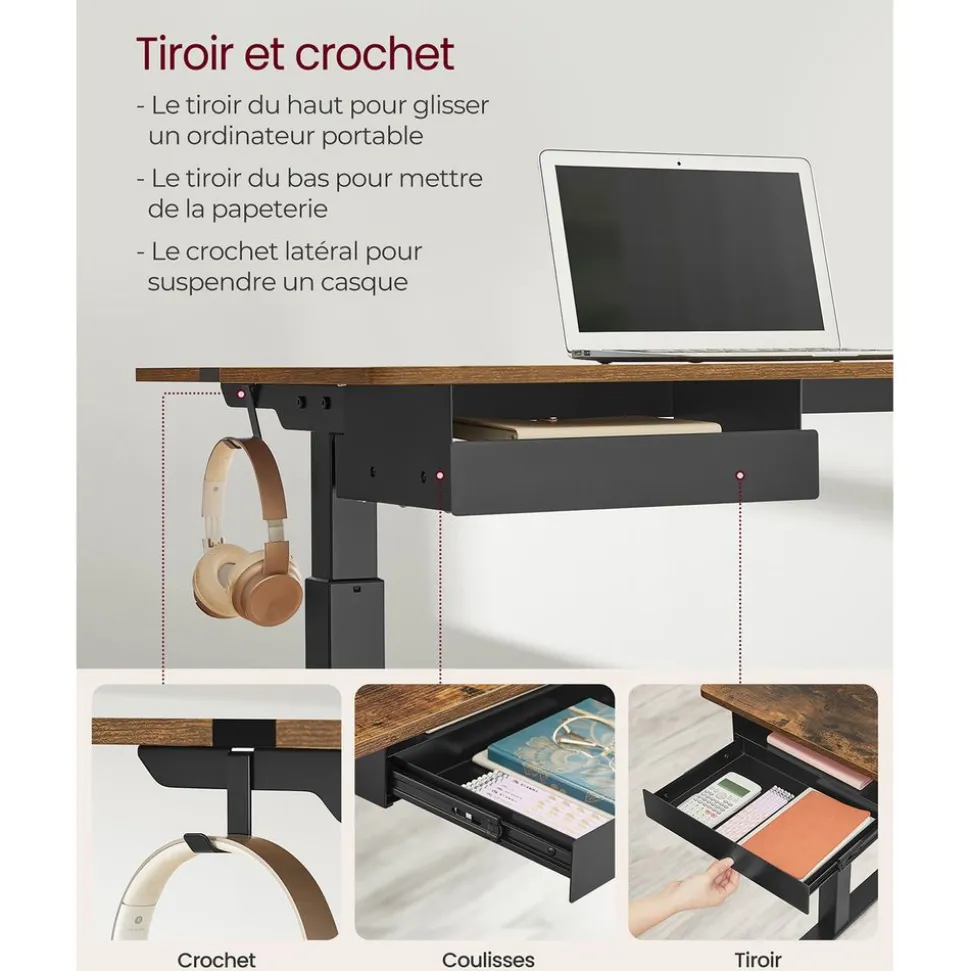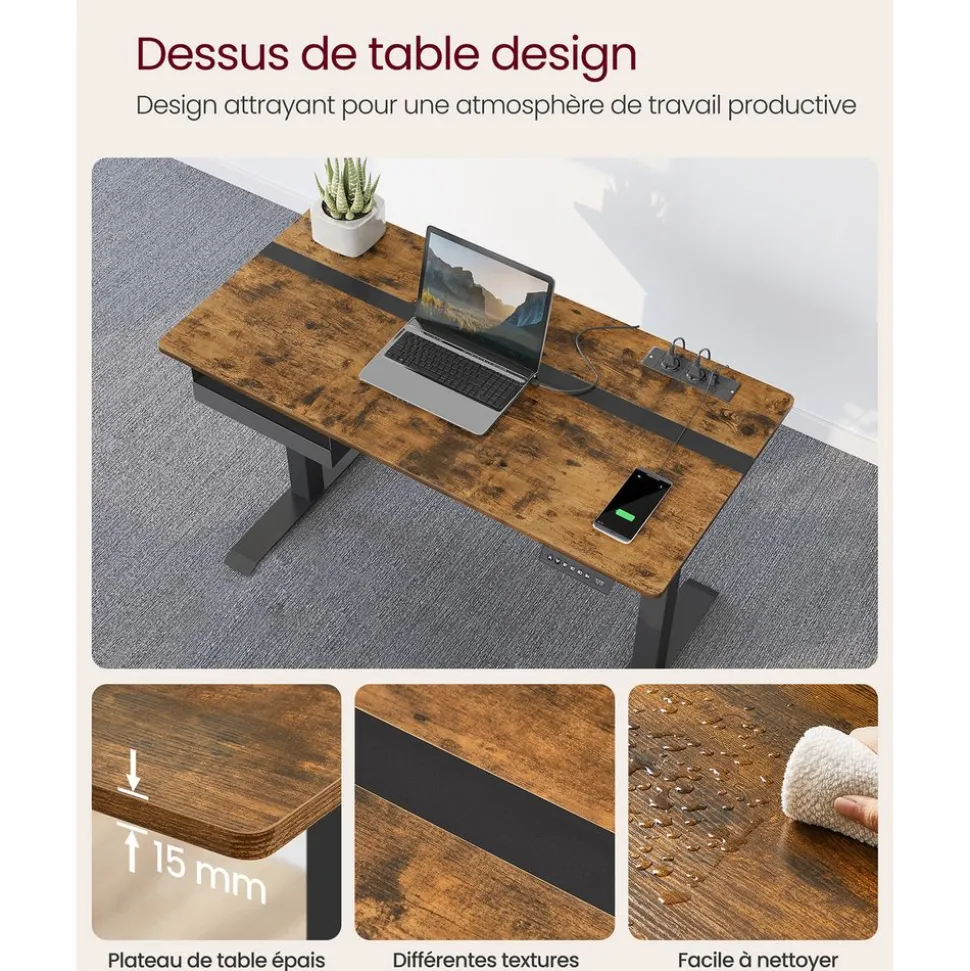 Support solide : Soutenu par un cadre en acier robuste, le grand dessus de table est en bois d’ingénierie qui peut supporter des charges jusqu’à 50 kg