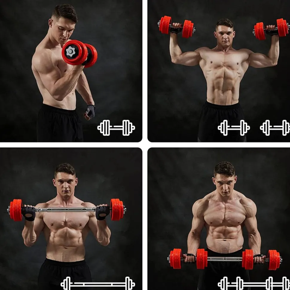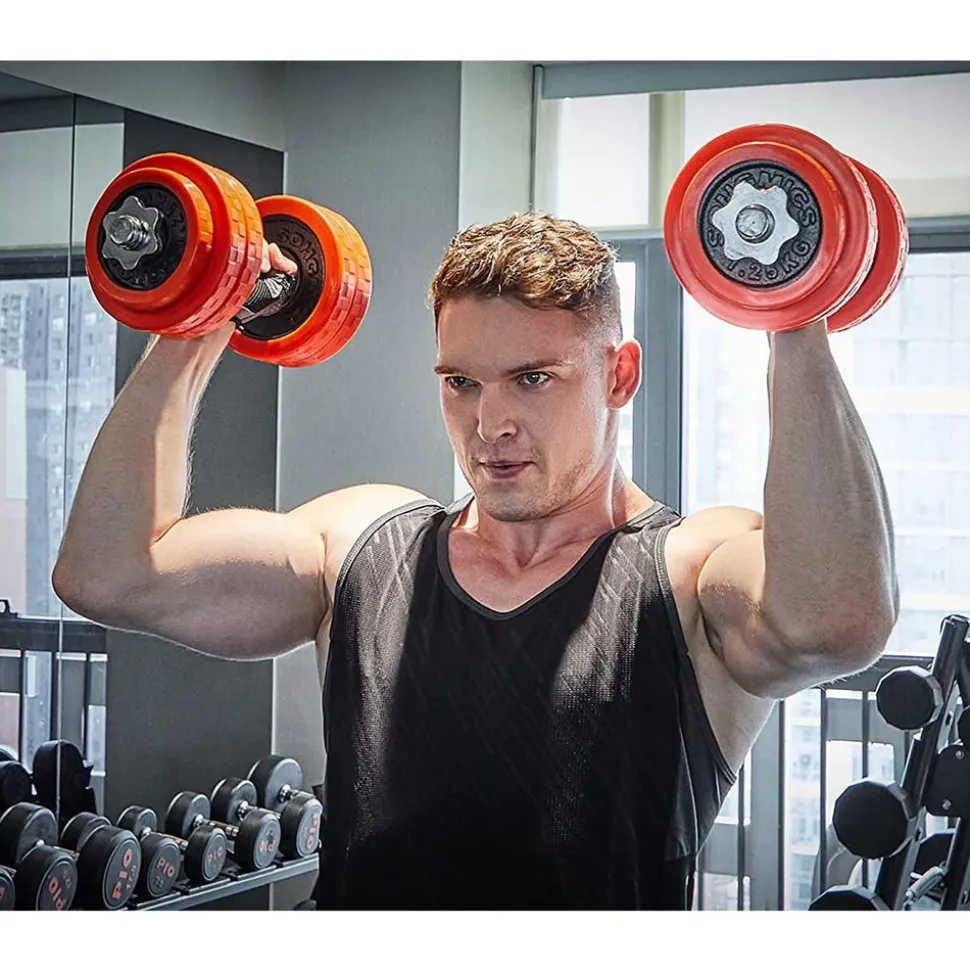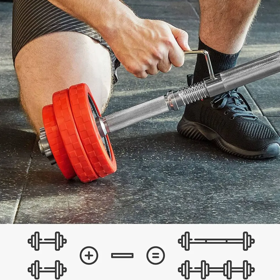 Matériaux : Poignées d’haltère en acier recouvert de plastique, barre d’extension en acier recouvert de mousse, protection de disque en PVC, coque de disque en acier traité par poudrage, rembourrage de disque en mélange de fer, sable et ciment, verrou en plastique polypropylène