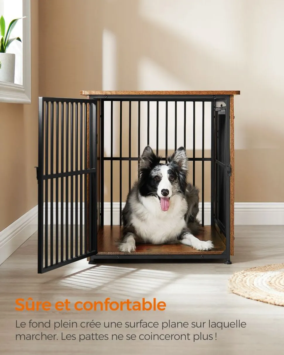 [Meuble partagé entre humains et chiens] Créez un havre de paix pour votre compagnon ou utilisez-le comme table d’appoint tout en embellissant votre intérieure. Ce meuble cage pour chien 2 en 1 répond à vos besoins et à ceux de votre ami à fourrure[Conçue pour durer] Cette niche pour chien comporte 35 tubes en acier renforcés (Ø10 mm) qui résistent aux mordillements frénétiques. Le panneau d’aggloméré, le cadre en tubes carrés et les traverses solides la rendent durable en toute fiabilité[Fond sûr et sécurisé] Fini les inquiétudes de voir votre chien se coincer les pattes grâce au fond plein et solide. Créez un sanctuaire stable et sûr pour que votre compagnon à poils puisse se reposer paisiblement[Porte à gauche ou à droite] À vous de décider. Cette cage est équipée de 2 portes (1 à l’avant et 1 sur le côté) pour permettre à votre chien d’entrer et sortir facilement ; la porte latérale peut être installée à droite ou à gauche[Choisissez la bonne taille] Avec une intérieure de 90 x 57 x 63 cm, cette cage convient aux chiens de taille moyenne pesant jusqu’à 32 kg (comme Husky, Border Collie, Shiba Inu, American Bully, etc.). Nous vous conseillons de mesurer votre chien