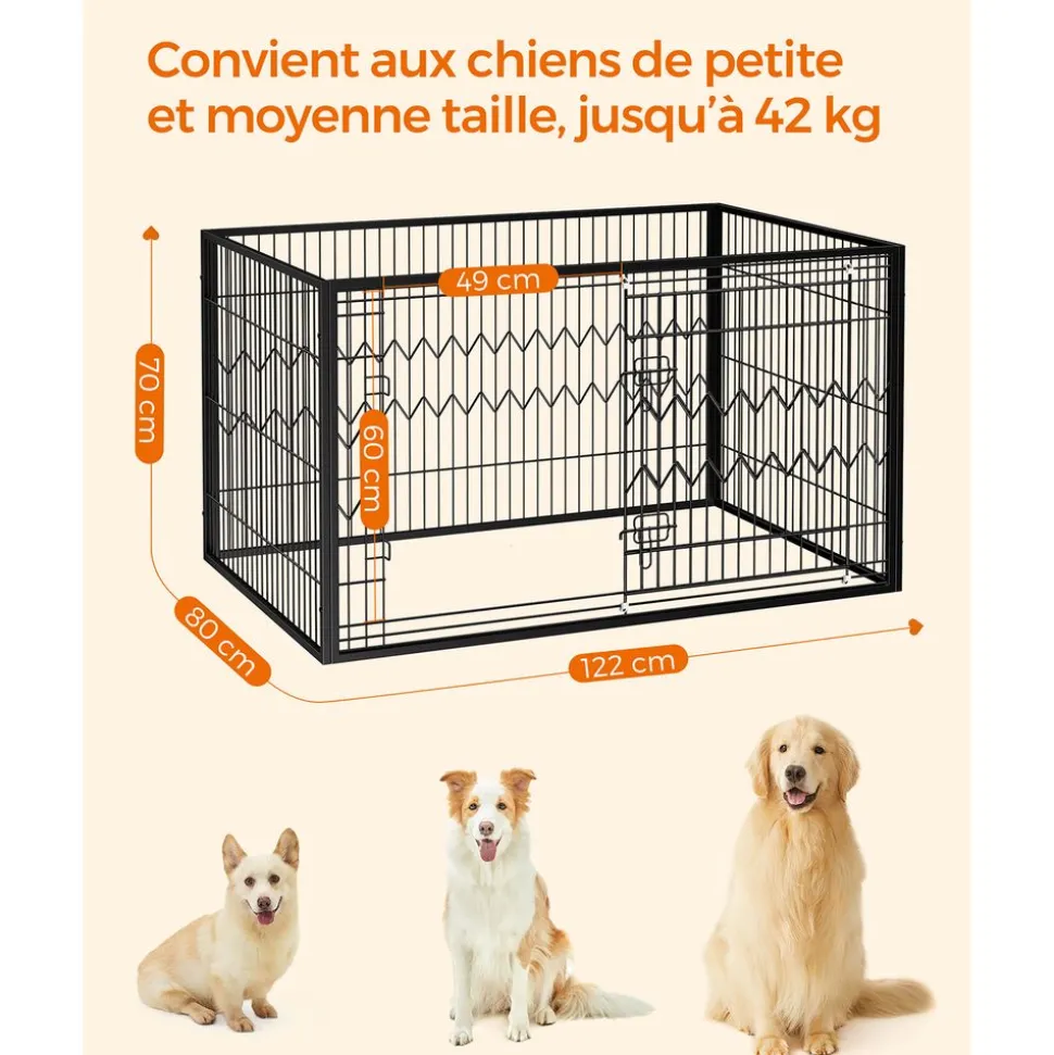 [Peut être placée à l’intérieur] Cet enclos pour animaux peut être utilisé à l’intérieur, il est spacieux et sécurisé pour votre chien. Pour jouer et se reposer ou pour la mise bas des chiots, il permet aux animaux de se sentir en sécurité[Durable et stable] Cet enclos est maintenu par des tubes d’acier et des fils d’acier à mailles fines (espacement 3,5 cm), il est renforcé par des fils d’acier en zigzag. Cette cage est robuste et stable, elle convient parfaitement aux chiots turbulents[Sûr et confortable] Sans bords tranchants, ce parc pour chien ne blesse pas les animaux. La porte coulissante est plus sûre qu’une porte abattante, elle ne claque pas de manière inopinée. Le bord de l’entrée est bas, c’est bien pour les genoux des animaux[Dimensions raisonnables] La taille de cet enclos est 122 x 80 x 70 cm, convient aux chiens de petite et moyenne taille de moins de 42 kg, il offre un grand espace intime à votre toutou[Facile à monter, à démonter et à ranger] Grâce à des instructions illustrées, le montage et le démontage de cette cage sont simples, ils se font en 5 minutes. En cas de non-utilisation, démontez-la et rangez-la pour gagner de la place