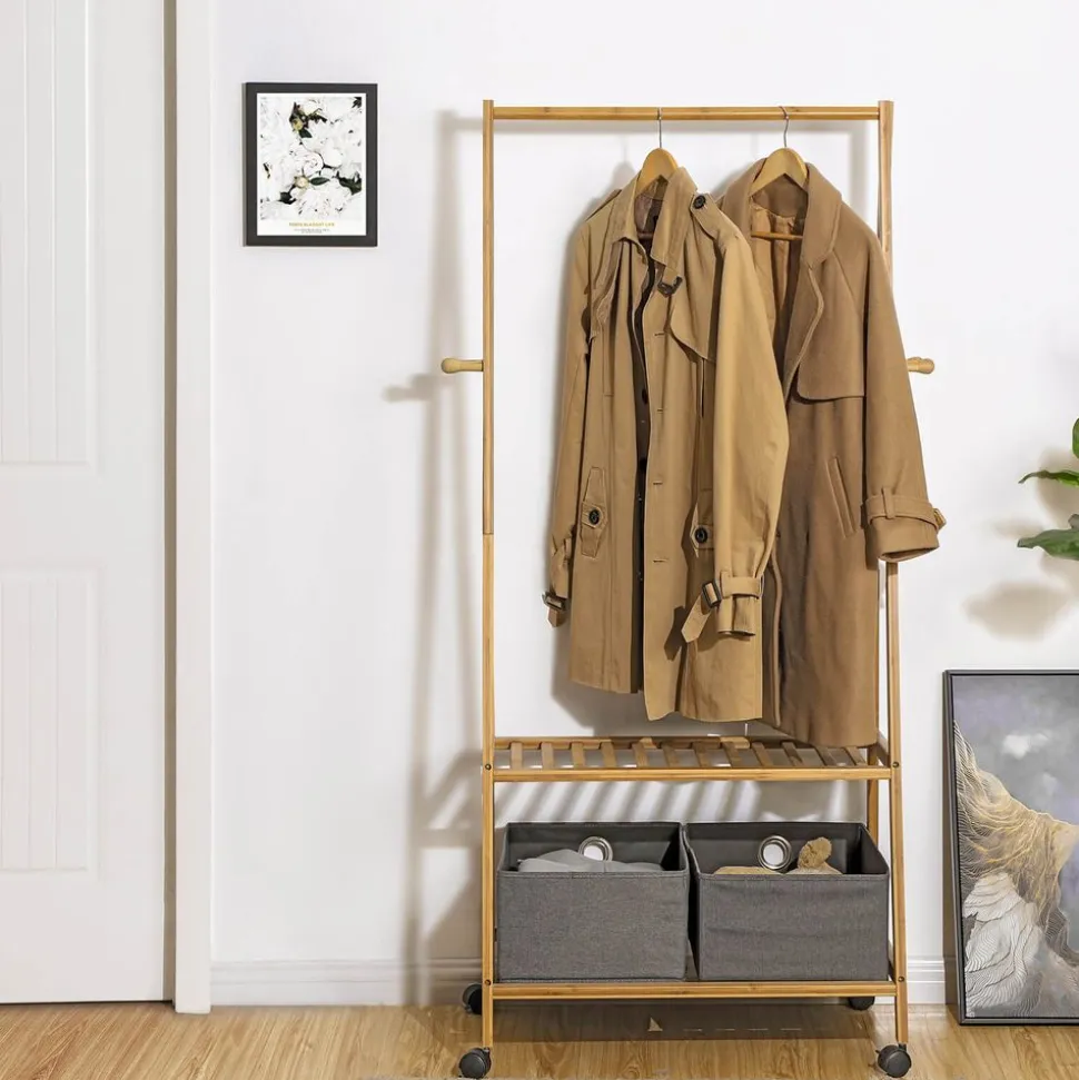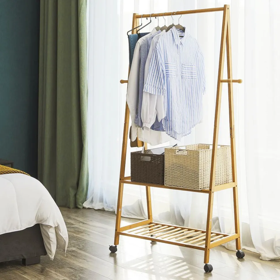 Ce portant à vêtements en bambou est une solution pratique pour accrocher et sécher vos vêtements. L’entreprise Songmics tient toujours à la protection et l’utilisation durable des ressources naturelles, Fabriqué 100% en bambou, ce produit est durable et respectueux de l’environnement. Avec 2 étagères, il profite bien de l’espace pour ranger vos affaires. Le montage et déplacement du produit sont très facile, vous pouvez le mettre à l’entrée ou dans le salon de votre maison. Sans aucun doute, Il va jouer un rôle très important dans la vie quotidienne. -