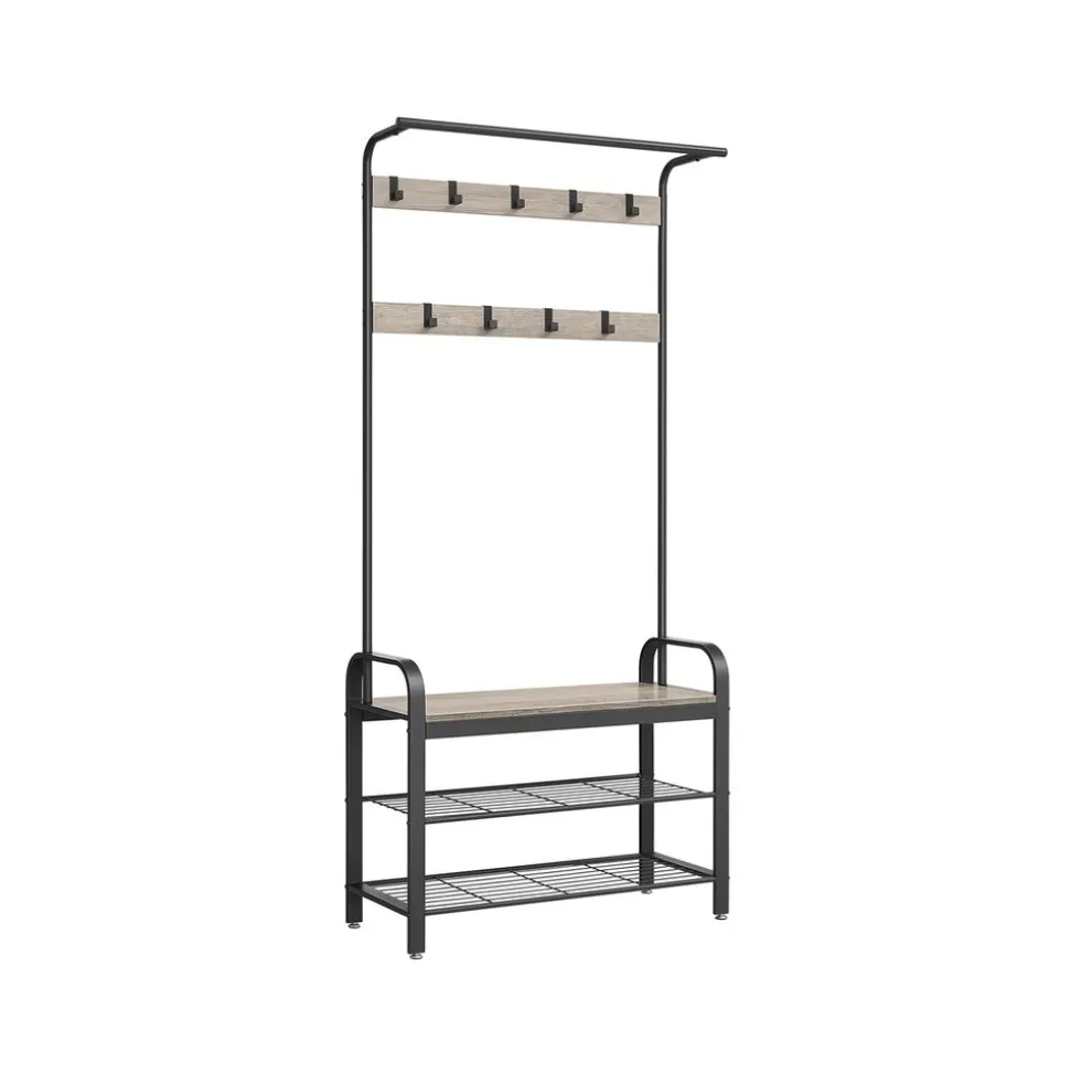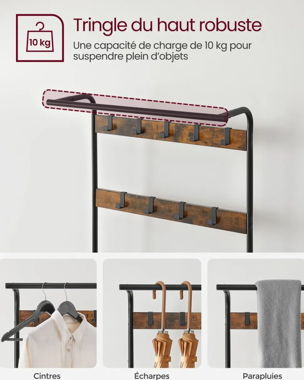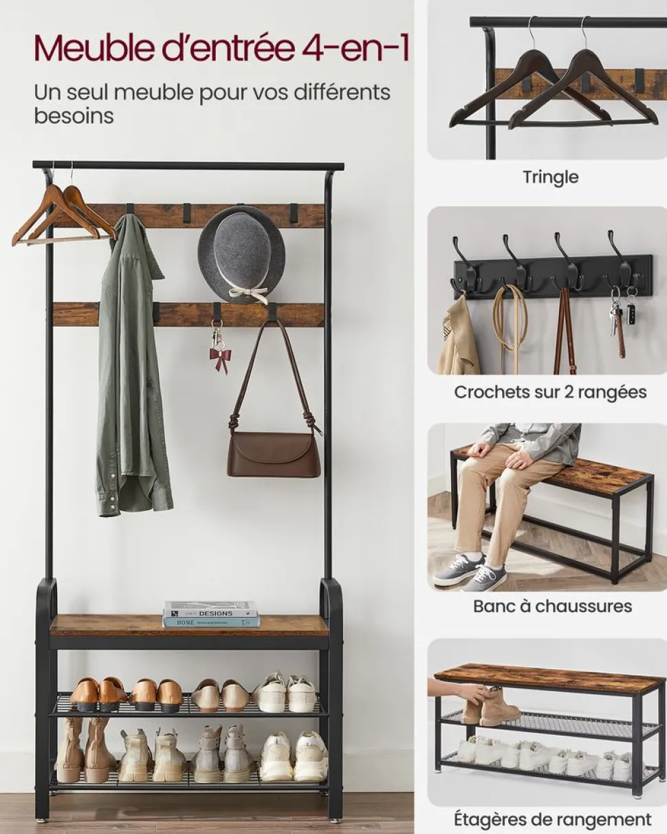 Paradis pour chaussures : Voilà 9 crochets et 1 tringle dans la partie supérieure et une étagère à 2 niveaux pour les chaussures en bas. Asseyez-vous sur le banc et mettez vos chaussures confortablement avant de partir !