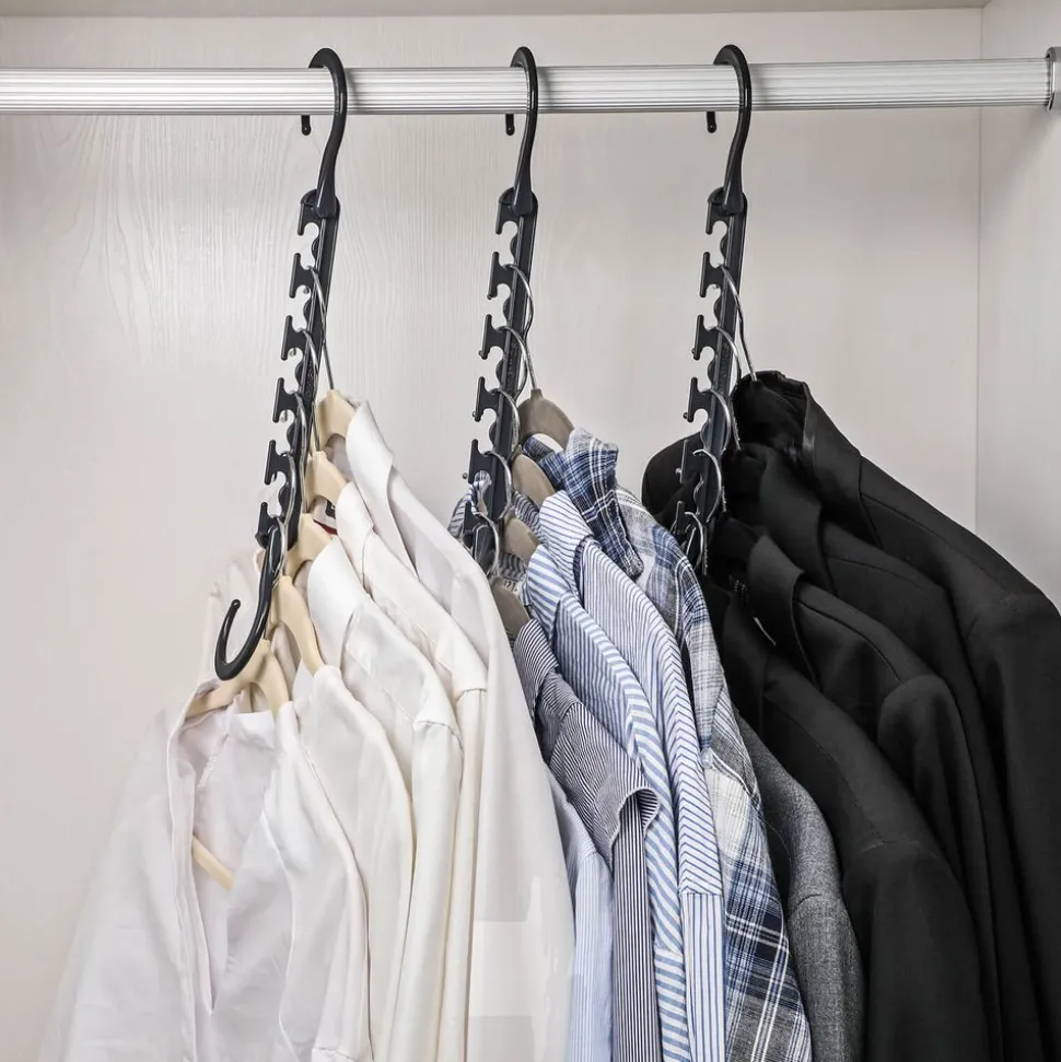 Une aide véritable pour gagner de la place, chaque cintre magique peut porter jusqu’à 10 chemises – Placez un anneaux du cintre magique sur la tringle, grâce à ce système, décalez l’épaisseur de vos vêtements et optimisez l’espace de rangement dans le sens vertical