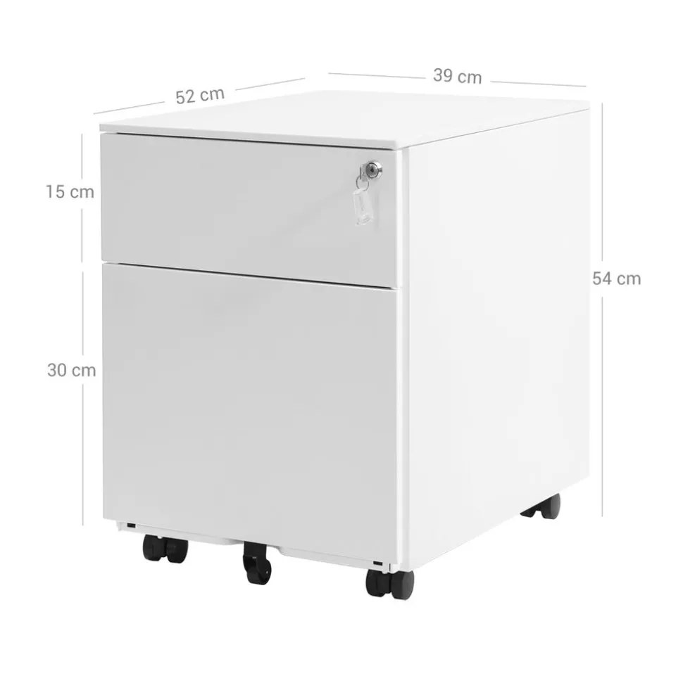 Pratique et durable : Vos papiers, vos documents, vos dossiers et tout ce dont vous avez besoin pendant le travail trouvera sa place dans ce caisson de bureau mobile. Chacun des 2 grands tiroirs a une capacité de charge de 23 kg et glisse sur des rails à pleine extension pour plus de commodité. En plus, la structure en acier du caisson est solide pour que vous puissiez l’utiliser pour des années à venir.