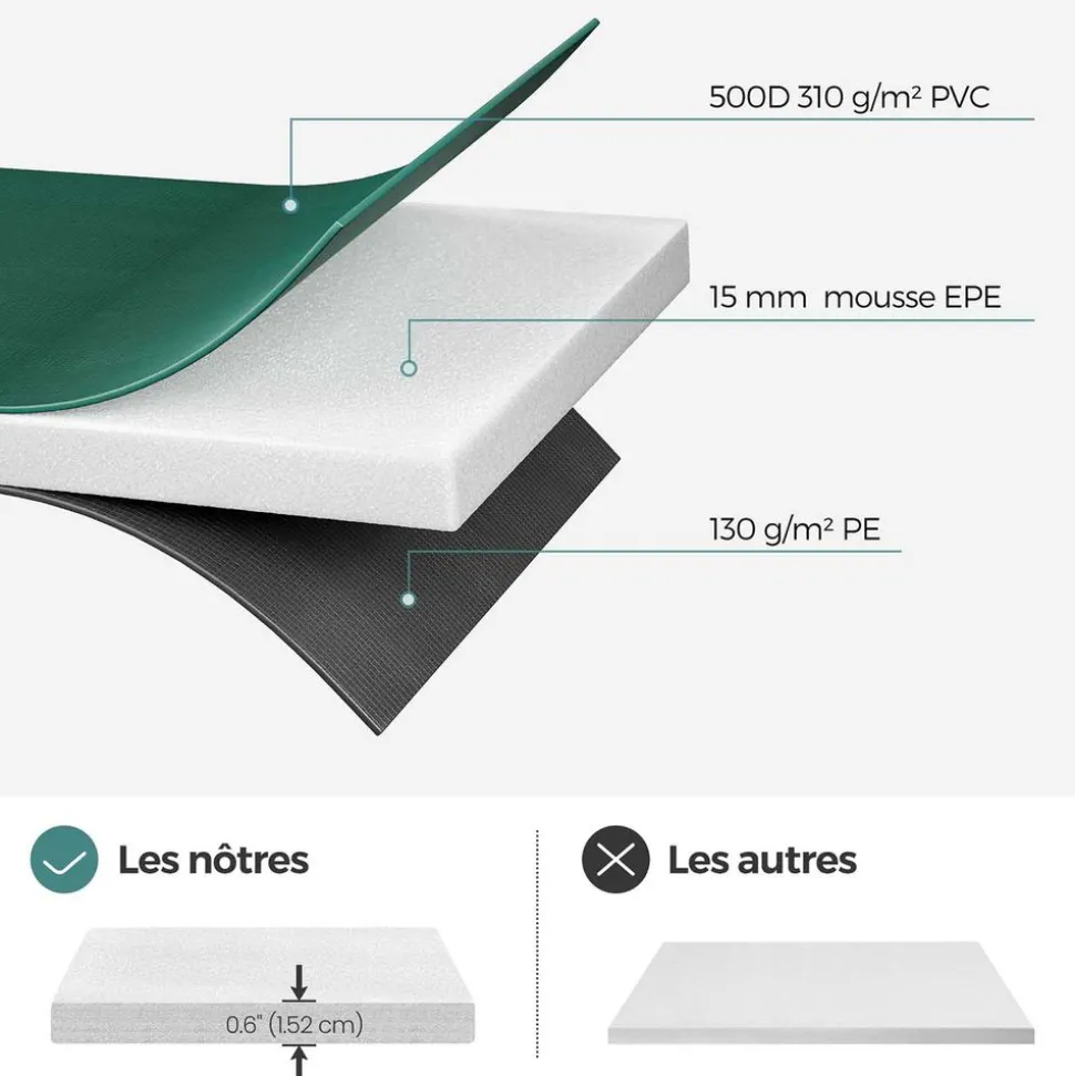 On utilise des matériaux de première qualité : une housse en PVC (500D) de 310 g/m² résistante aux UV et à l’eau, une mousse EPE de 15 mm d’épaisseur, une base en PE de 130 g/㎡ et des coutures raffinées pour assurer sa résistance à l’usure
