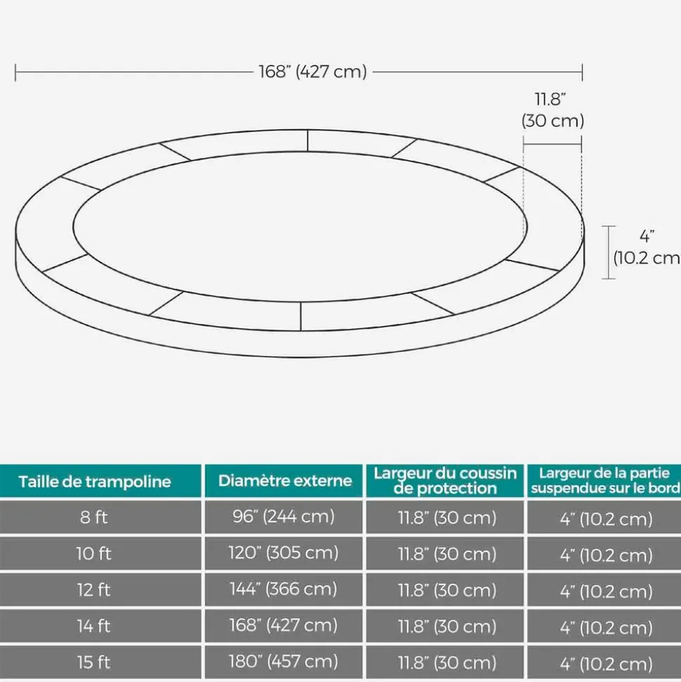 - Seul le coussin de protection est inclus. Le trampoline sur les photos n’est pas inclus.
