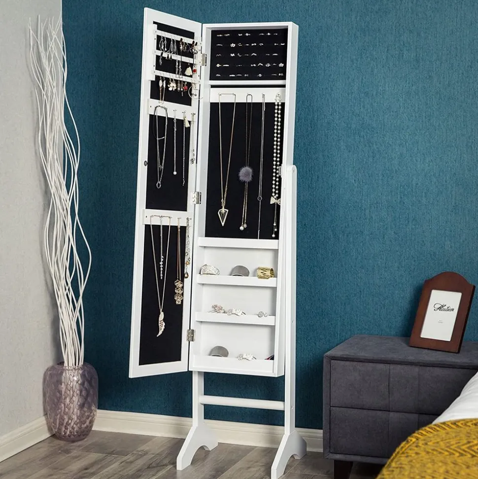 Cette armoire à bijoux avec miroir est un produit idéal et sécurisé pour ranger tous vos bijoux et accessoires de beauté. Très élégante avec sa couleur, l’armoire sera parfaite dans une chambre, le dressing, les boudoirs, les garde robes ou les couloirs. Elle dispose de crochets et de petites étagères pour contenir toute votre collections de bijoux, de lunettes, etc. Vous aurez aussi de la place pour ranger vos plus beaux foulards et écharpes. L’armoire peut pivoter en arrière pour avoir une meilleur vision de tous vos bijoux.