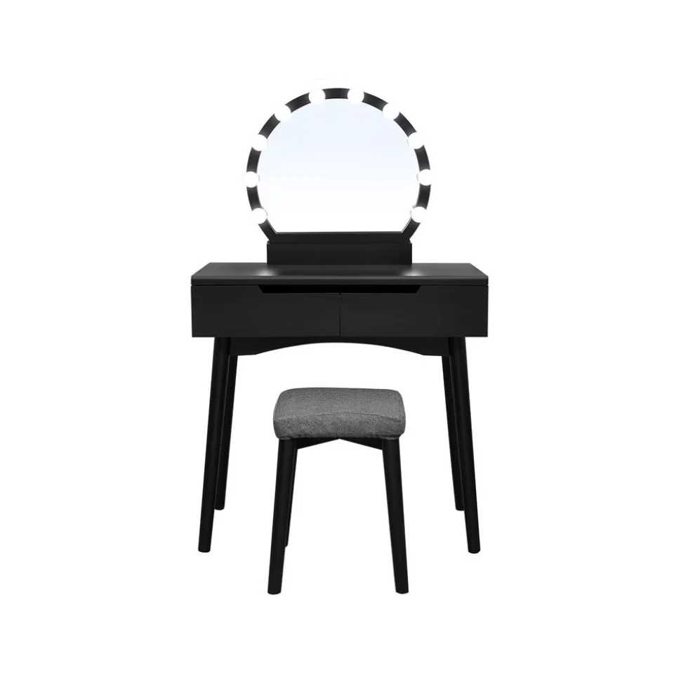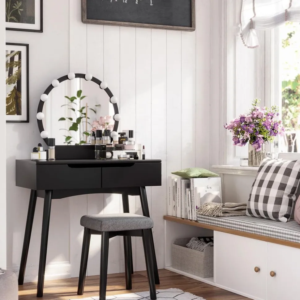 CE QUE VOUS RECEVEZ : Une coiffeuse avecdes tiroirs préassemblés, un miroir rond, 10 ampoules et une ampoule de secours, un tabouret rembourré avec housse, un sachet d’accessoires ainsi qu’un mode d’emploi illustré.[Précaution] Pour des raisons de sécurité, veuillez impérativement fixer le produit au mur avec le dispositif anti-basculement fourni