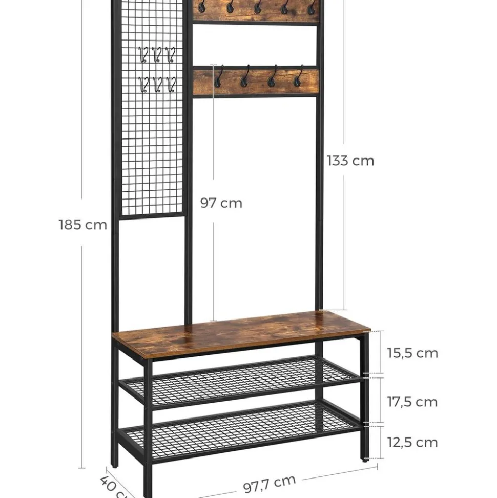 – Couleur : Brun rustique– Matériaux : Panneau d’aggloméré, fer– Dimensions : 97,7 x 40 x 185 cm (L x l x H)– Poids : 17,6 kg– Capacité de charge statique max. du crochet : 3 kg– Capacité de charge statique max. du banc : 100 kg– Capacité de charge statique max. de l’étagère en maille : 20 kg/niveauLivraison :– 1 x Portemanteau– 1 x Kit de montage (avec clé Allen)– 1 x Kit anti-basculement– 1 x Mode d’emploi (FR, DE, EN, ES, IT)Précautions de VASAGLE :– Il est interdit aux enfants de monter sur le produit et de jouer avec.– La capacité de charge statique maximale du banc est de 100 kg. Veuillez ne pas dépasser cette limite.– Pour des raisons de sécurité, veuillez fixer le produit au mur avec le dispositif anti-basculement fourni.