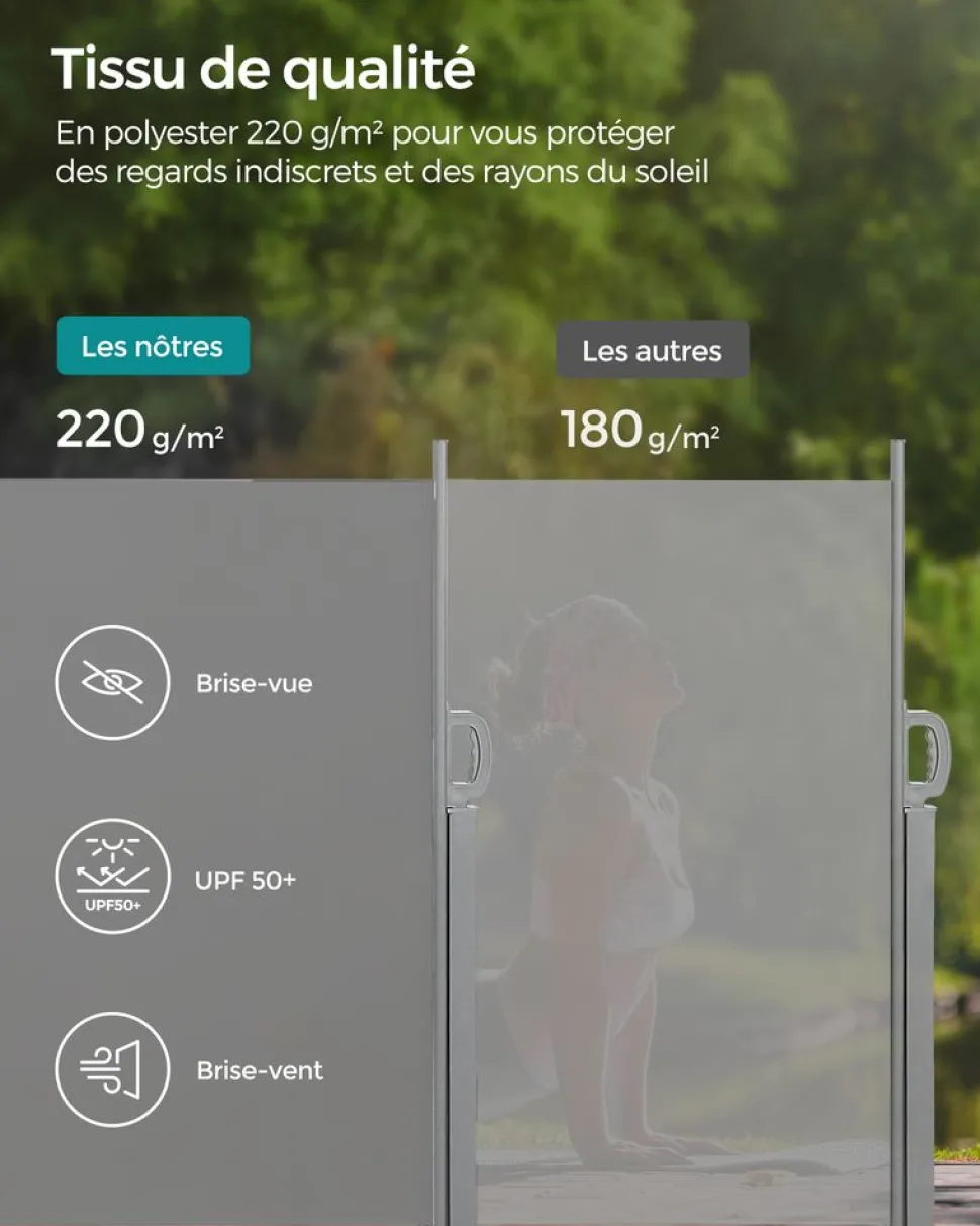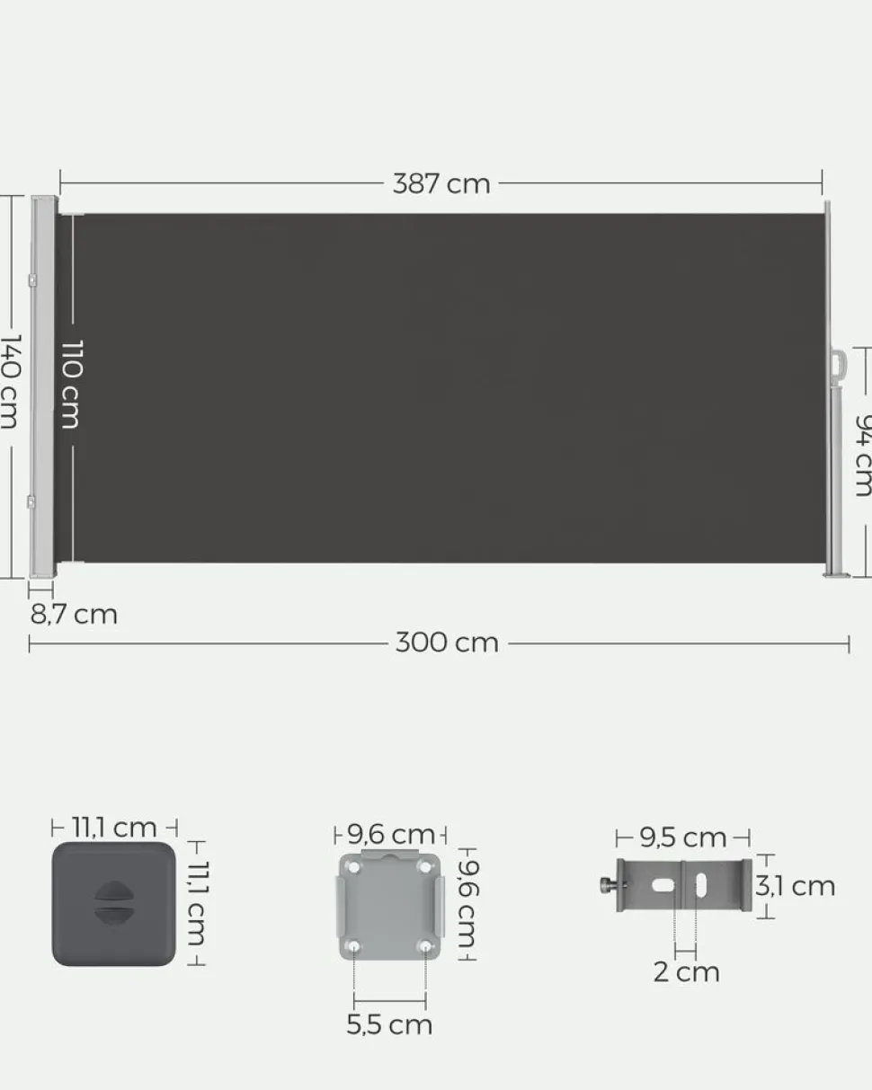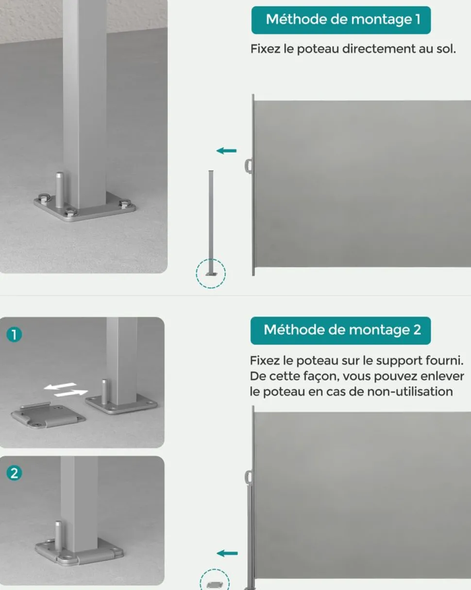 - Est-il possible d’enlever un auvent double-face après l’installation sur le sol dur ? C’est réalisable avec ce socle SONGMICS. Il suffit de glisser la cassette du store. Le store latéral est prêt à vous protéger des rayons forts du soleil et des regards indiscrets des voisins.
