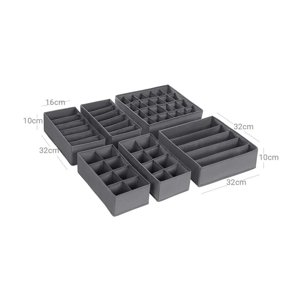 RANGEMENT : 2 produits à 5 cases (32 x 32 x 10 cm) pour des soutiens-gorge, 2 produits à 6 cases (32 x 16 x 10 cm) pour des culottes, 2 produits à 8 cases (32 x 16 x 10 cm) pour des cravates, 2 produits à 24 cases (32 x 32 x 10 cm) pour des chaussettes
