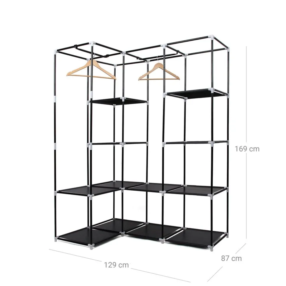 Haute qualité – Composée de tubes antirouilles et de pièces de liaison de haute gamme, la structure de l’armoire est solide et résistante. Sous la charge uniforme, chaque paroi peut supporter au plus 5 kg de charge. La charge maximale de la barre de pendaison est de 25 kg, ce qui mieux répond à vos besoins