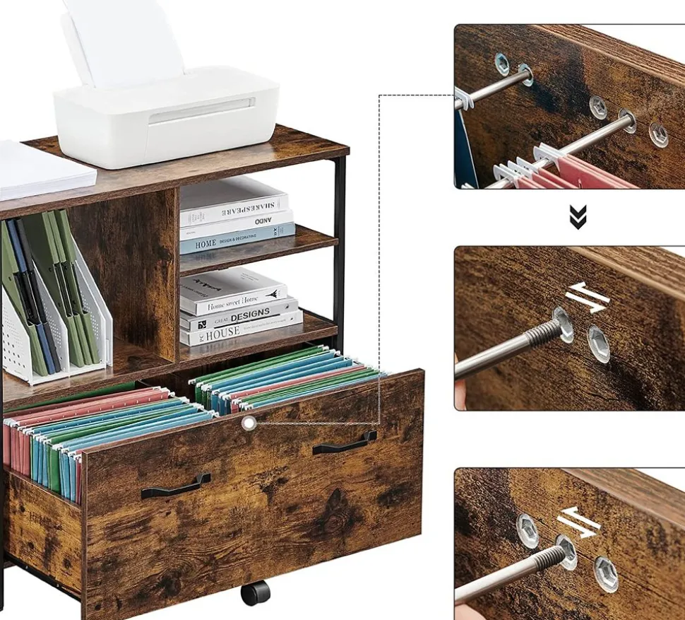 Ce que vous obtenez : Un caisson de bureau SONGMICS avec 3 tiroirs, 1 organisateur de tiroir, 1 barre pour dossier suspendu et 5 roulettes (2 ont des freins pour rester en place, 1 au centre pour plus de stabilité). Mettez de l’ordre dans votre bureau !